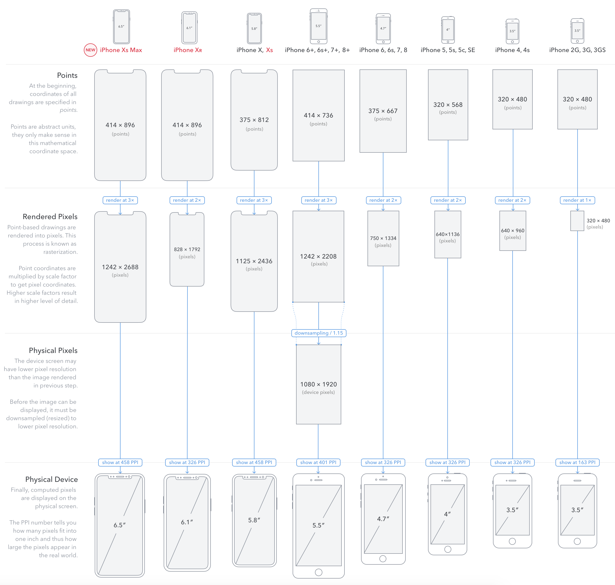 @Supermallet, you were probably thinking of the 8 Plus screen, which is first rendered at 2208x1242 before it's downsampled to 1920x1080. See diagram above. That represents 414x736 points, multiplied x 3. You'll also note that 414 number is the same as with both the Max and the XR, meaning the amount of information that can be displayed width-wise is exactly the same for all three models (Plus, XR, Max).