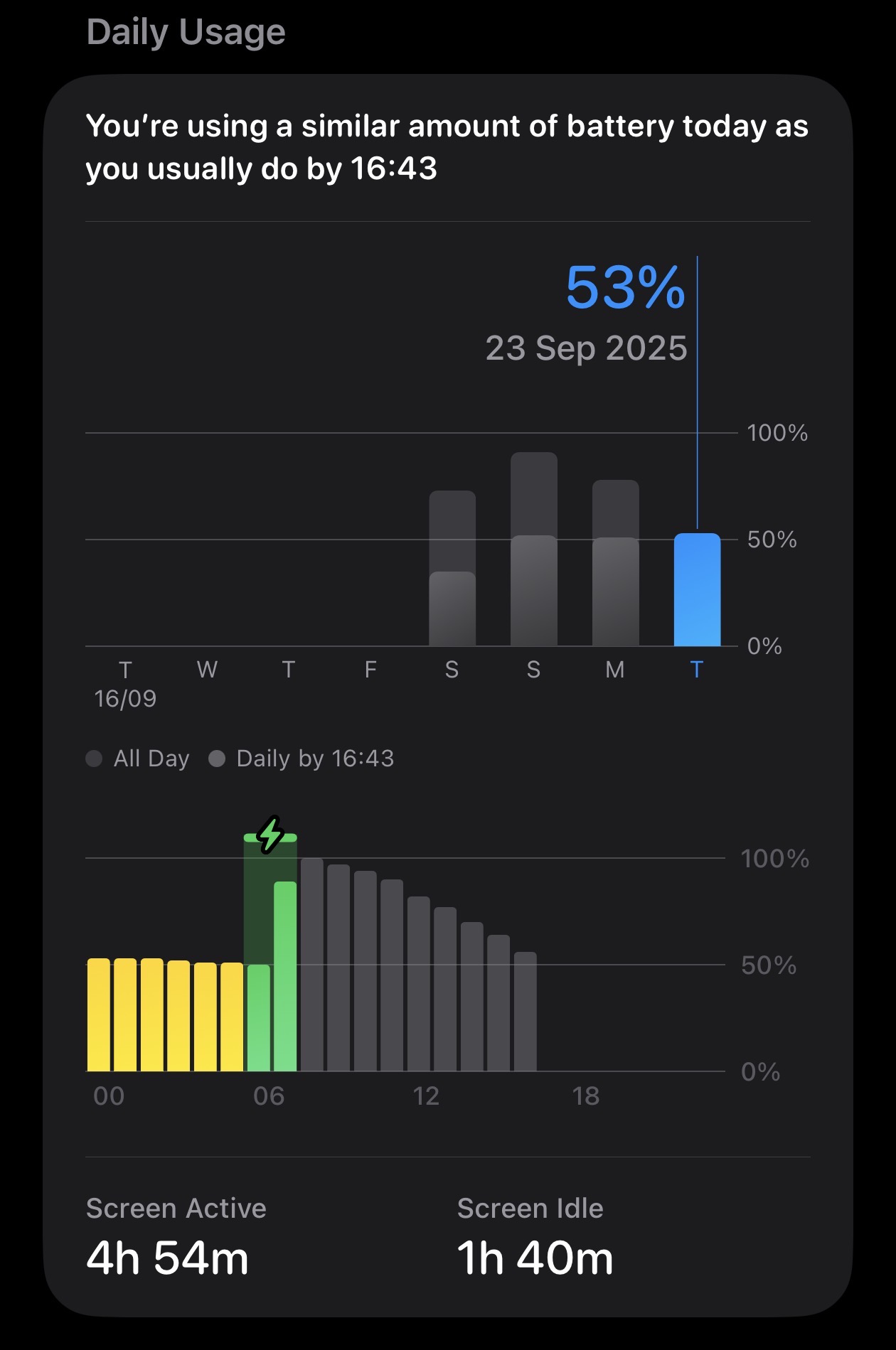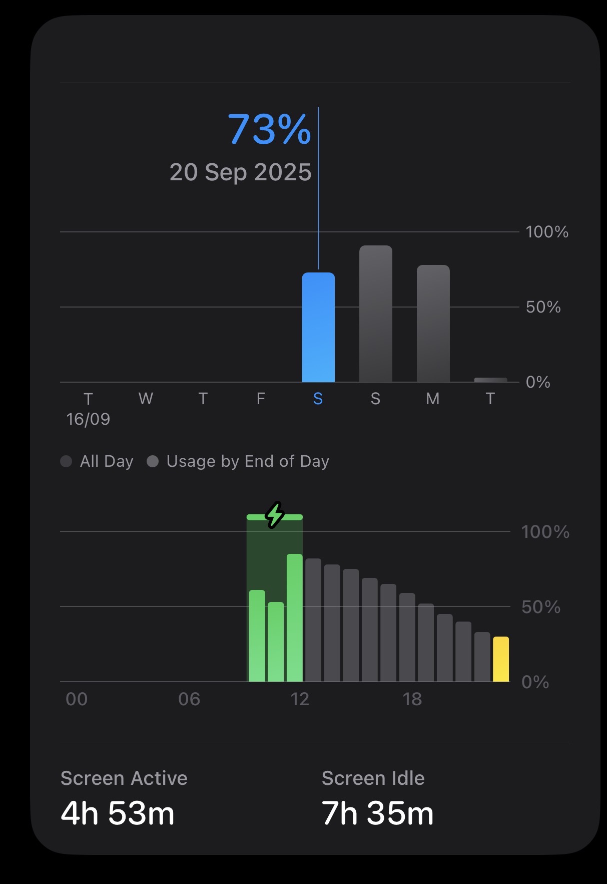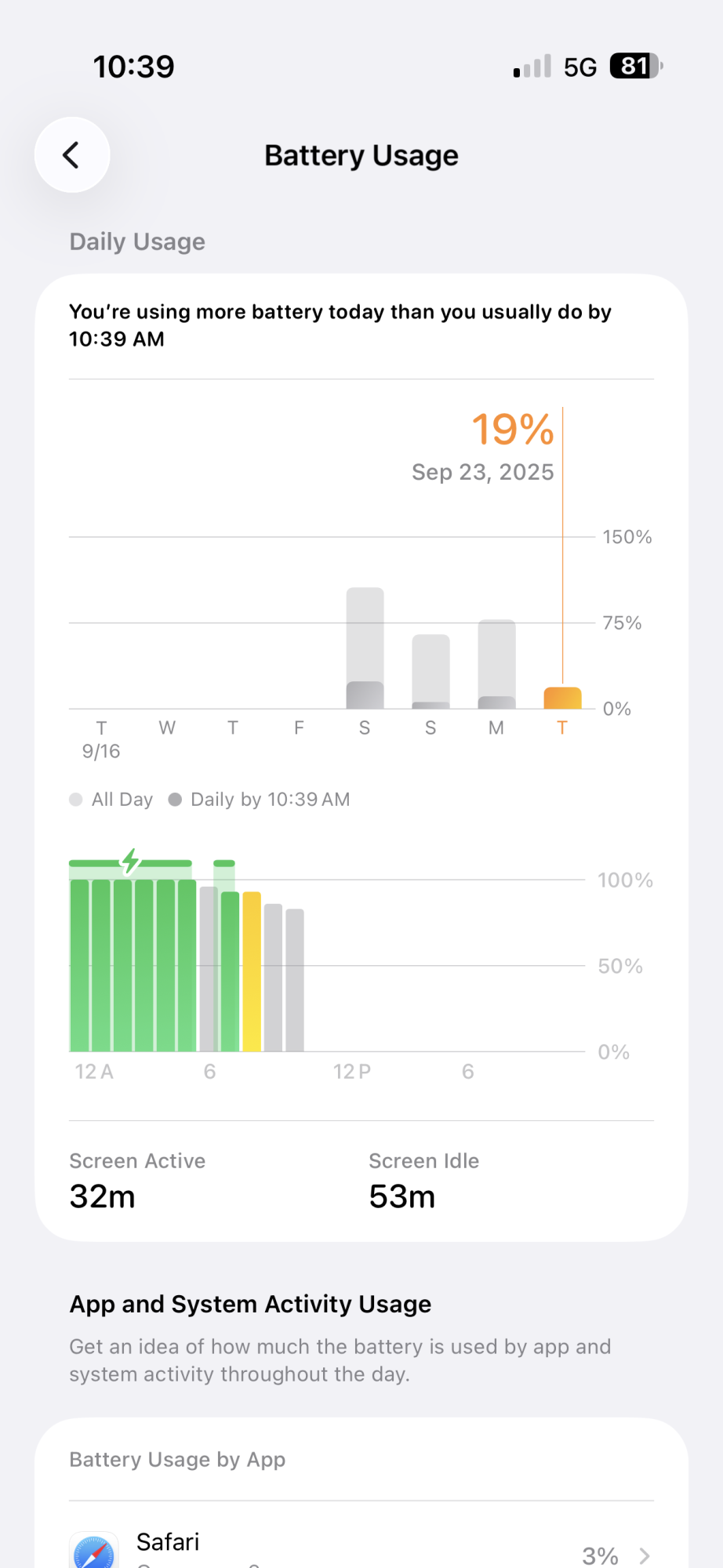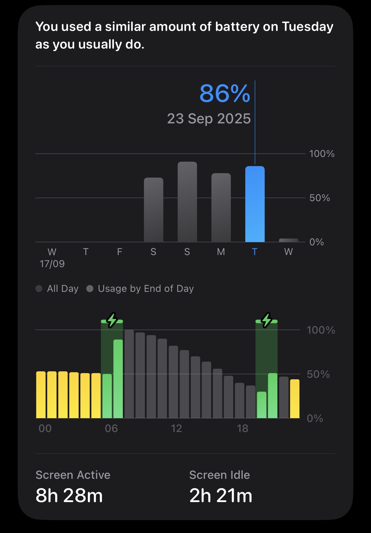 Now I have a key question before I can compare: there is a massive difference between Monday (8.5 hours with 78% used) and Saturday (5 hours with 73% used). Since iOS 26’s new battery screen is garbage, how should I interpret that?
