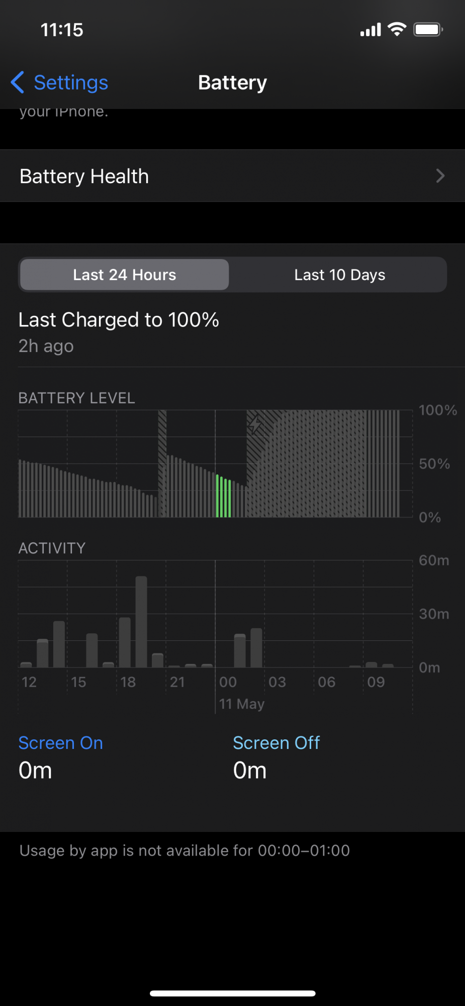 Here is another from a few weeks ago when it all began. The battery drained from 12 a.m. to 3 a.m. regardless of usage. I've even marked the one hour section after midnight which shows zero minutes of even touching the phone but it dropped from around 40 to 30% in this time. I charged the phone through the night and the next day the drain stopped, coming back some days later.