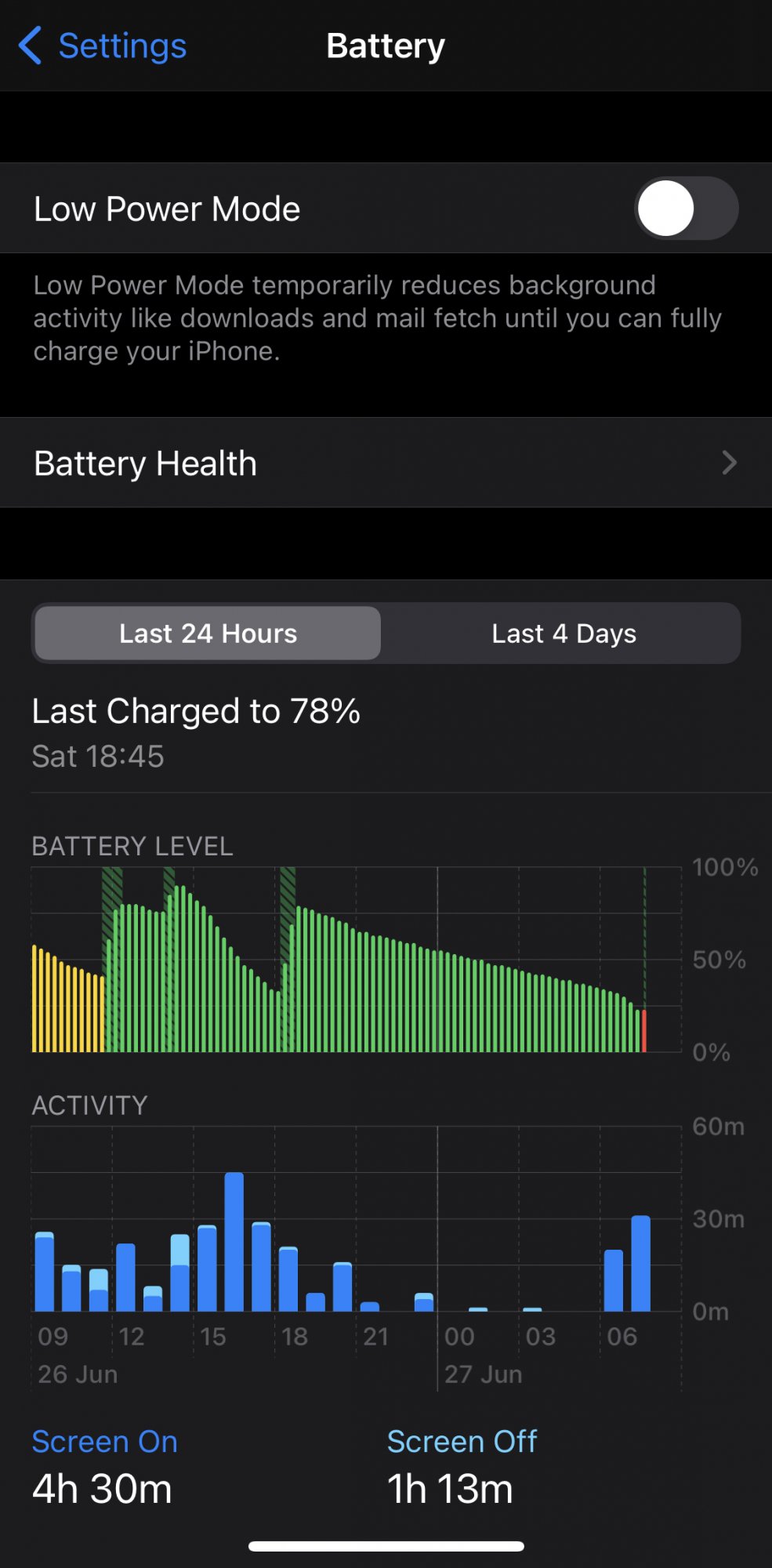 This one was taken yesterday with iOS 14.6. The drop to 90% is plausible, I used the phone for one hour. But the drop afterwards to 75% is absolutely unexplainable and I don't get such drops by not using the phone on other days. The phone was next to my work desk the whole time with the wifi router five feet away.