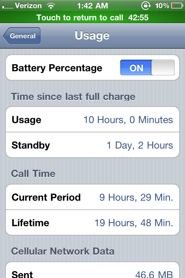 I have been having weird issues it seems with battery life on my iphone. I have about 2 hours and 48 minutes of usage and 13 hours and 11 minutes of standby time on my phone and my battery is at 59%. Shouldn't the battery be lasting longer than it currently is? I mainly use my phone for texting, except for the occasional CNN, Twitter, or Angry Birds app usage. I never close any apps from the multi-tasking tray except Pandora. Should I close them all out and will I get better battery life? Thanks guys.