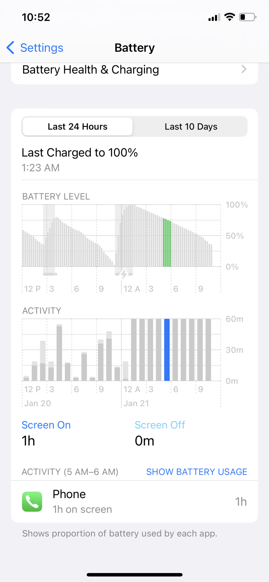 In the second screenshot, you can see the details of the 5am-6am block, where it says my screen is “on” for a full hour. It was only on by ‘iPhone’, but again, it was in slee mode and I was sleeping! It’s like this all night long. Is that normal?
