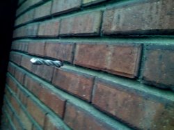 This is a pic my partner took of a drilling going through the brick wall of our house. We were drilling a hole through the wall to string cable through. We were so excited we measured and got it in between the brick.