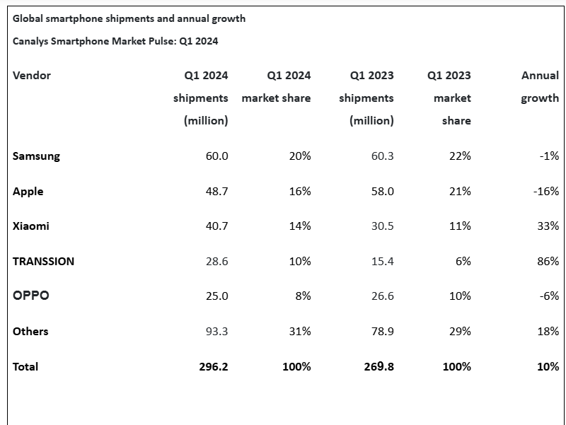 Canalys Newsroom - Global smartphone market kicked off 2024 with a robust 10% growth in Q1