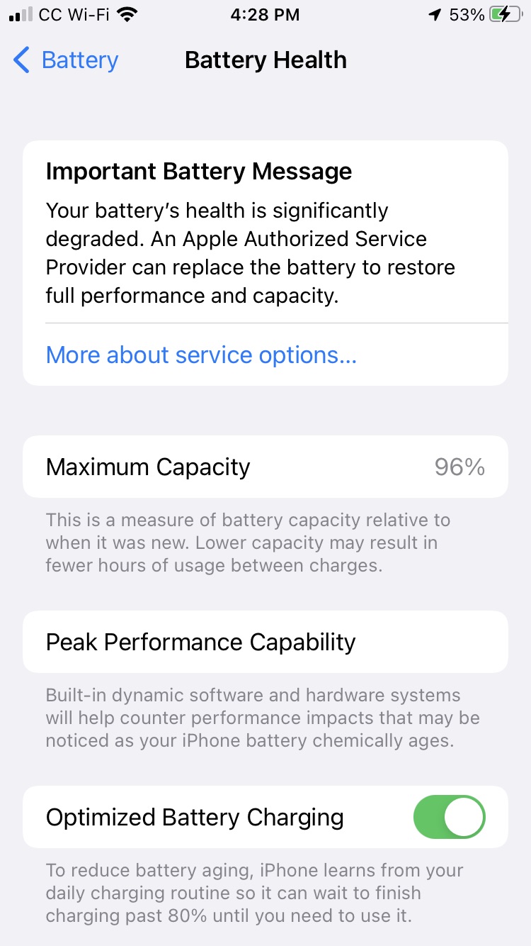 Then today I noticed my charge was down to 43% and I checked the battery stats to see whats using all the power and under battery health says “service”.