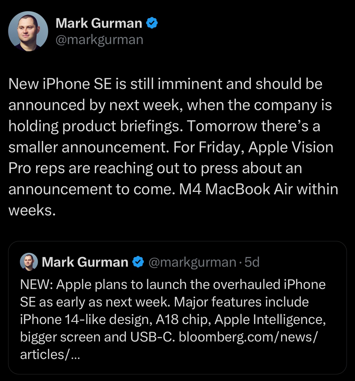 Tomorrow? No it’s Friday I think bro… tomorrow isn’t Friday…at least we're getting a vision pro-related announcement tomorrow!