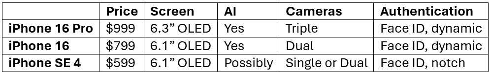 - A 'budget' model, the model for people who want something cheap: the iPhone SE 4