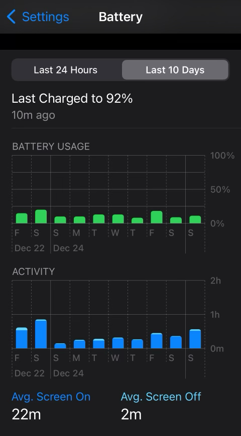 I don’t live on my phone. Here’s the last ten days of battery usage on my mini 13. The previous Fri and Sat had more than usual usage at almost an hour!