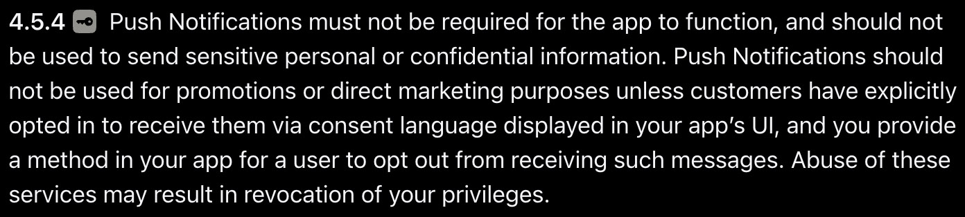 Apple doesn't enforce this. I get push notifications for promotions from major pizza companies and there is no way to opt-out in the app without opting-out of order-related notifications.