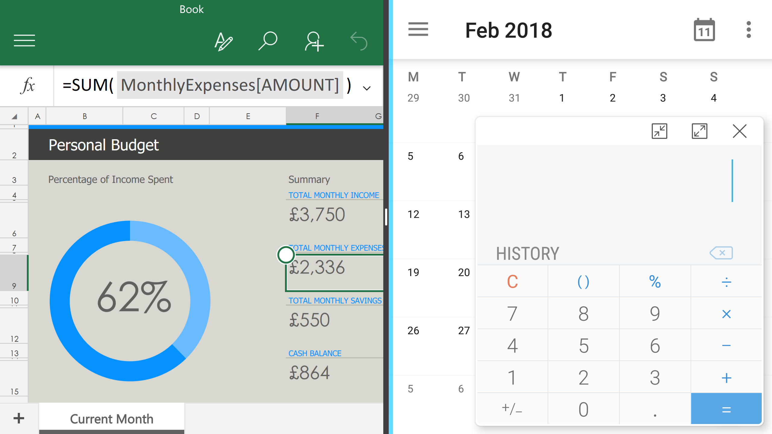 Yeah... no. Fitting a calculator and a calendar over an Excel sheet on a 5 inch phone and "productive" don't mix. Sorry.