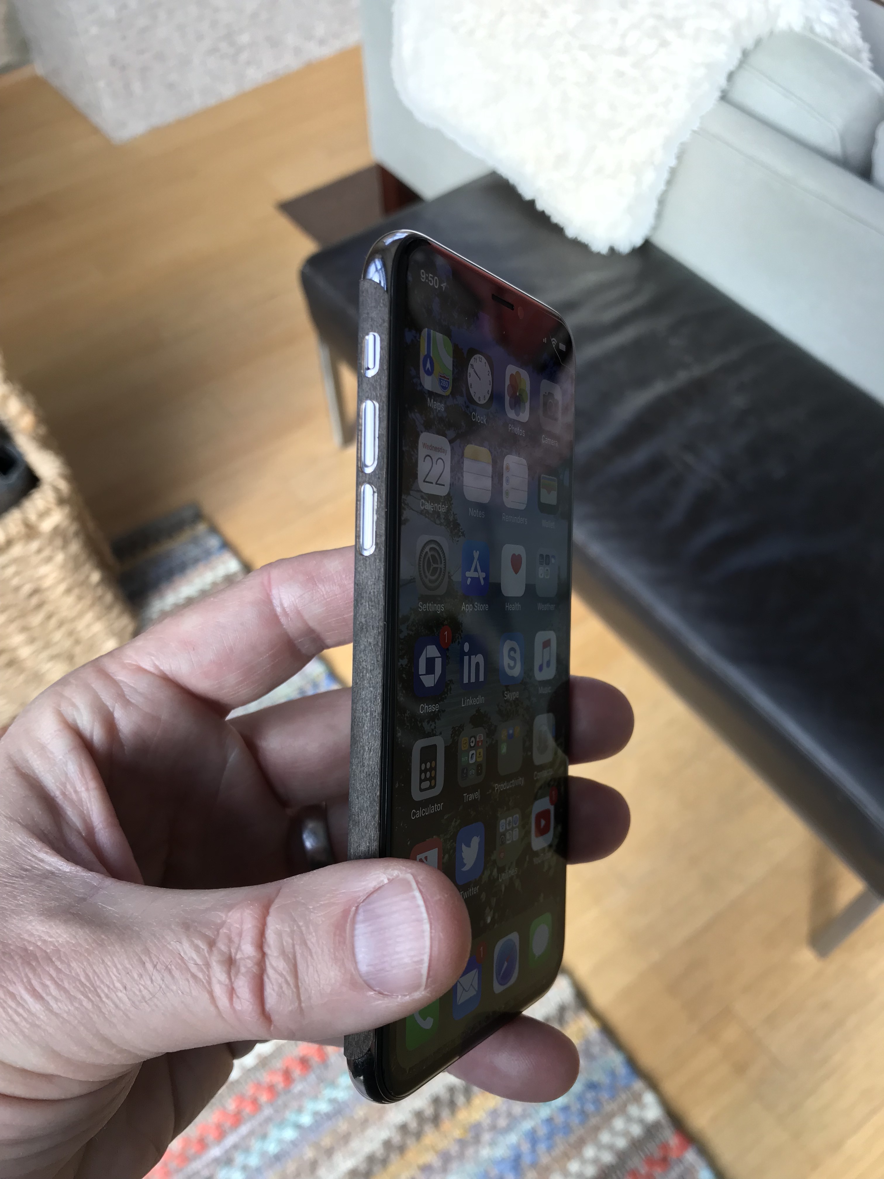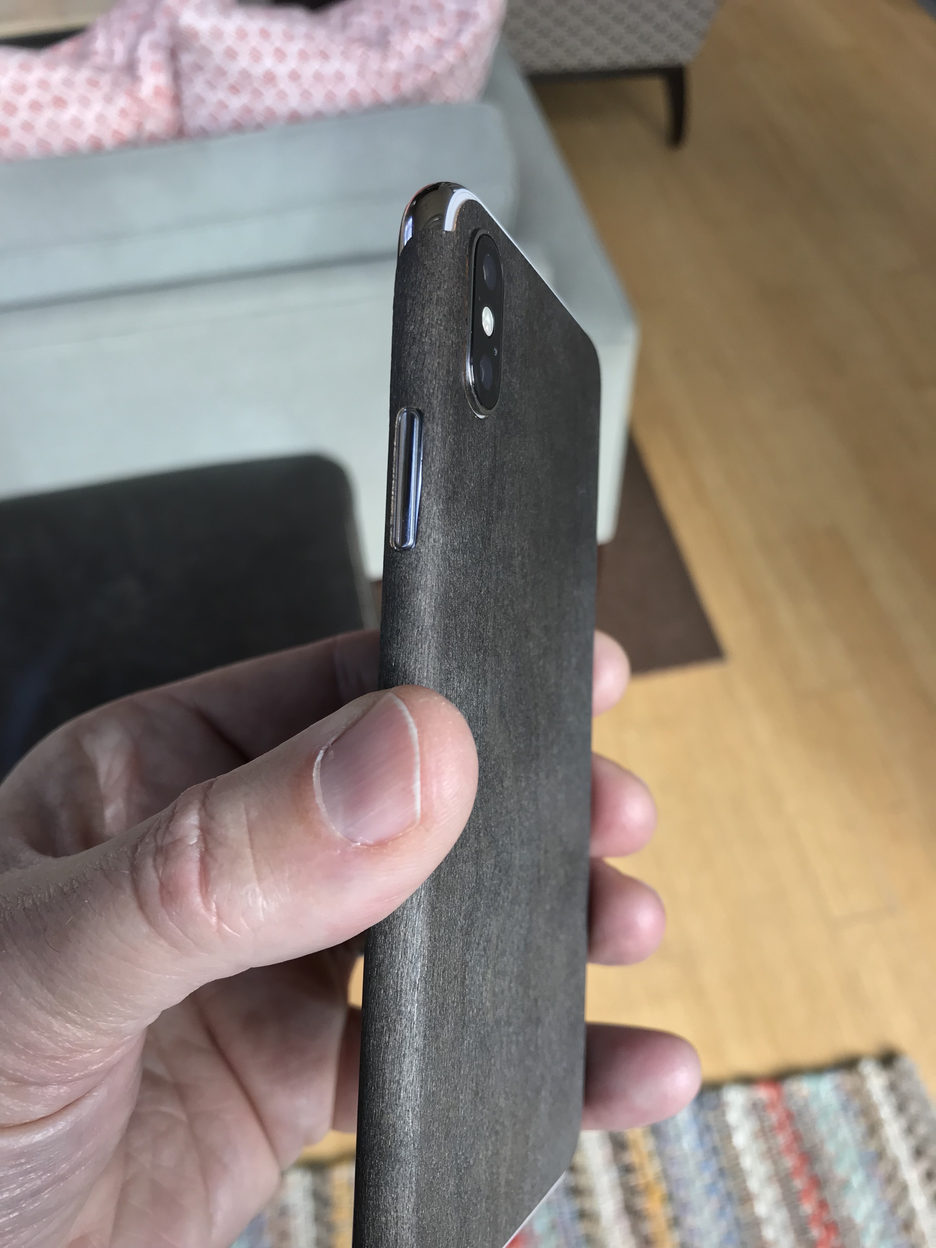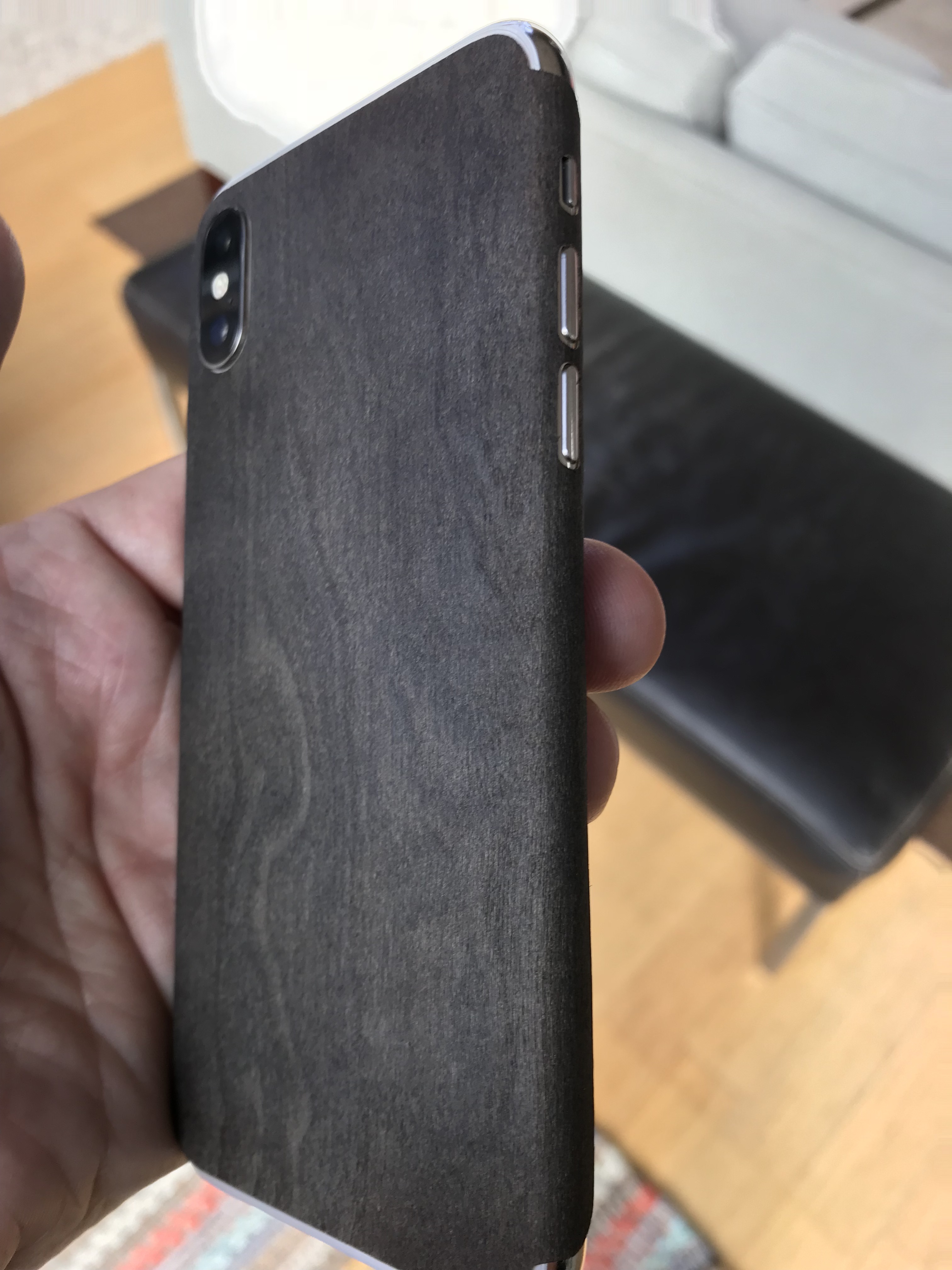 I got my new iPhone X yesterday and created the world's first real wood wrap for it. This is not vinyl printed to look like wood, nor is it what every other company offering laser cut wood veneer backers is doing. This is real wood (American Black Cherry in this example), peeled at just .008" / .2032mm that ends up being just .010" / .25mm thick with the pressure sensitive adhesive back on it.