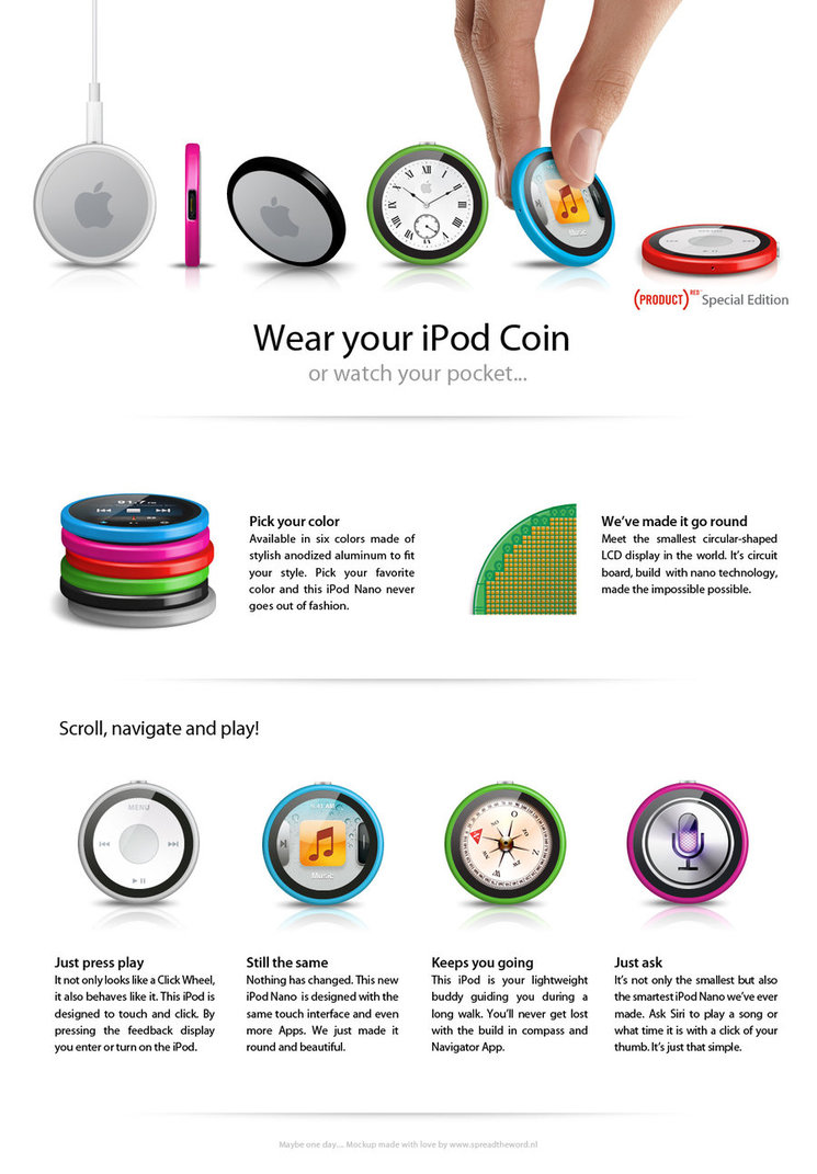 I know that a circular display would be kind of revolutionairy but there are rumors about this technique. Also, if one company would be first to do this it should be Apple, right? Let's call it the iPod Nano Coin or PocketPod...