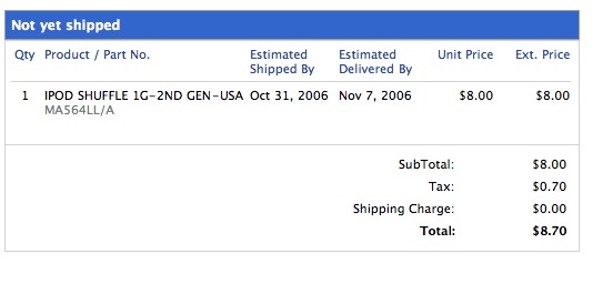 If a recent report from ThinkSecret holds true, Apple may be experiencing extremely high demand for the player, as reportedly Apple's retail stores have been told that shipments to them will be delayed until "mid-November" at the earliest. In addition, resellers such as Amazon are reported to have updated their shipping estimates to November 25th - December 9.
