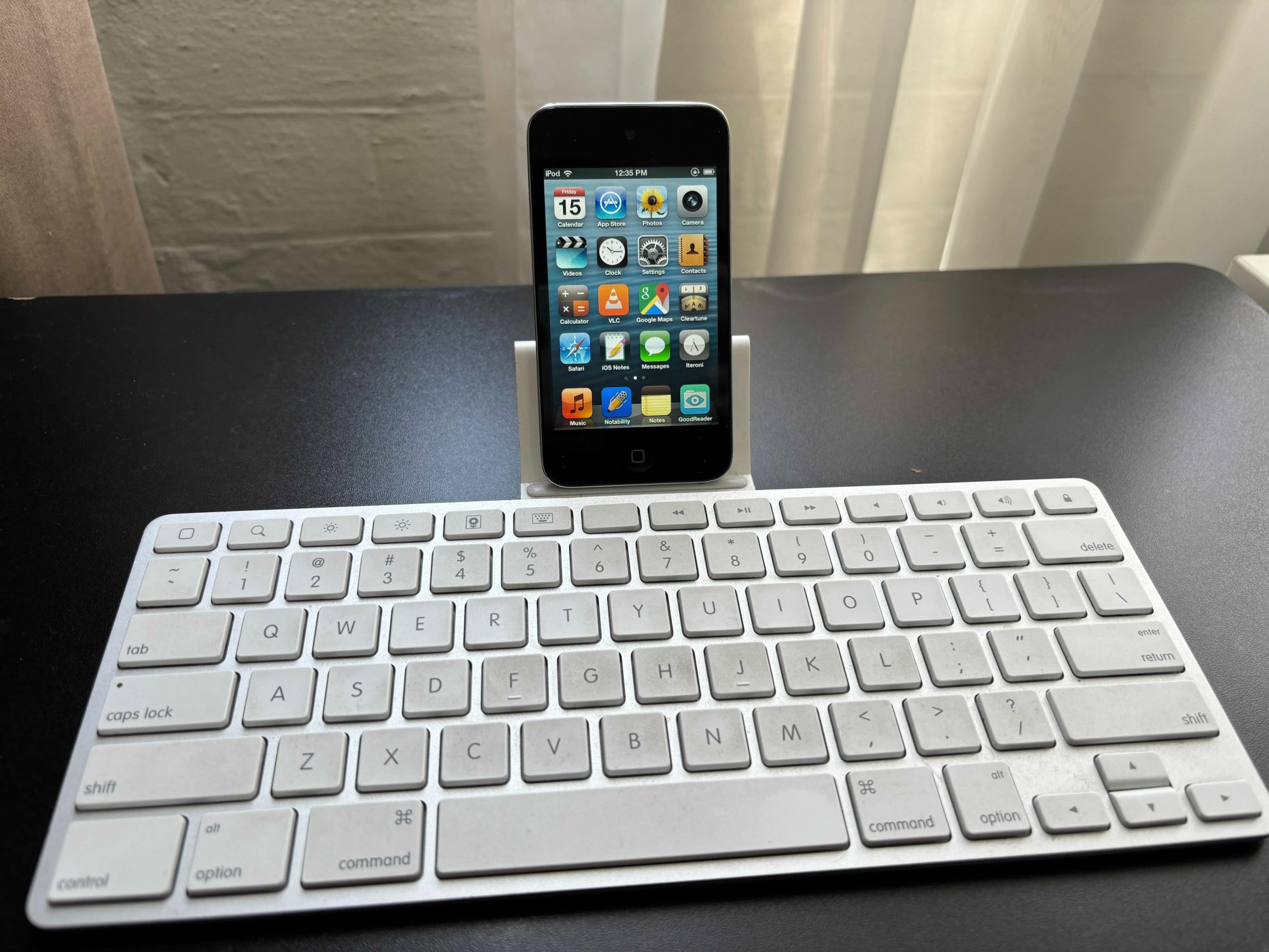 The 4th Gen iPod Touch still fits the old keyboard dock, allowing vintage app use. For modern interfacing, utilize the web browser's aNotepad or email/iMessage notes to yourself.