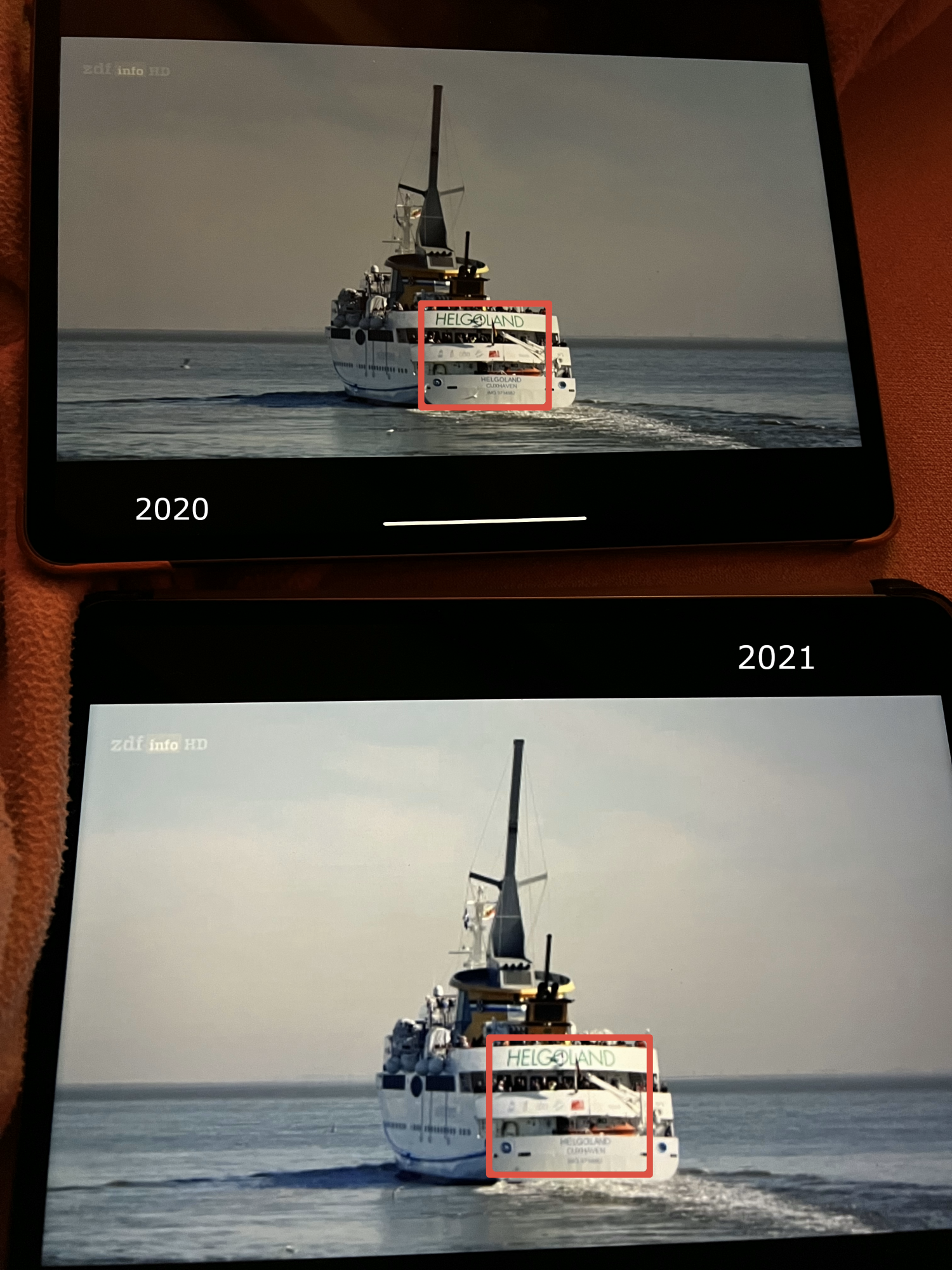 I have attached two pictures for comparing the iPads, marking the areas where the problem was striking to my eyes (pay special attention to the number plate on the car and the ship's name). For good measure I also made a comparison that demonstrates the blooming effect (here visible in two stages).