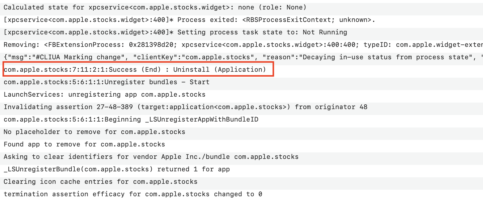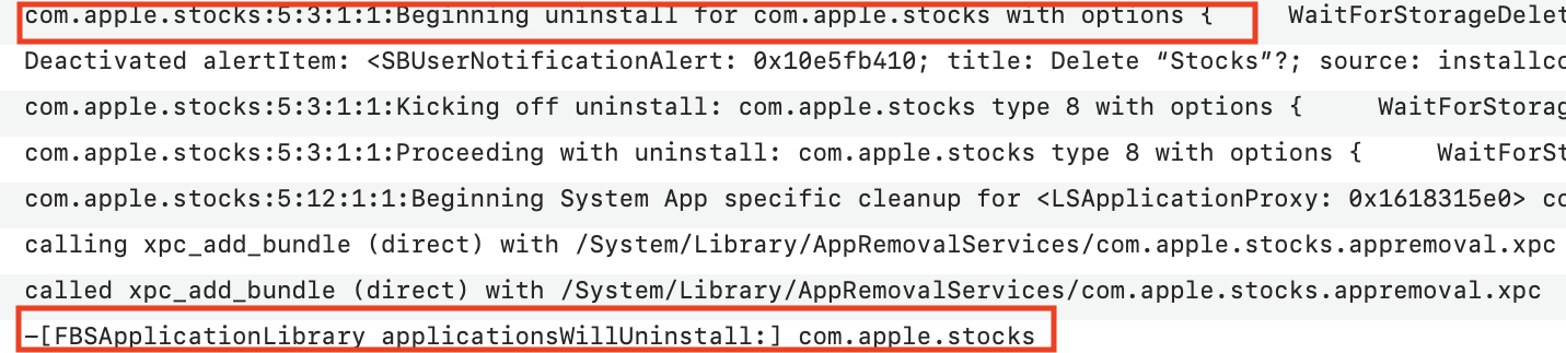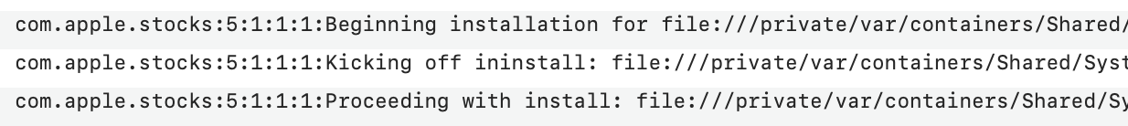 If I go through the process of deleting and reinstalling a 1st party and while running Console and Xcode (stocks.app)....