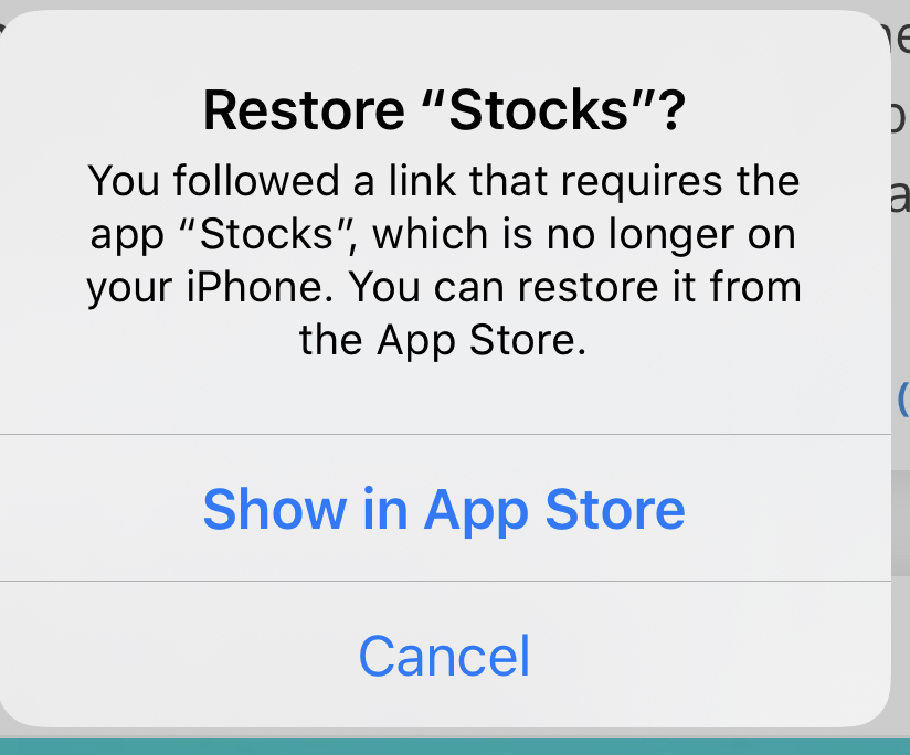Try to use a universal link from safari (ex. stocks://?symbol=AAPL) to verify the stock.app isn't accessible...