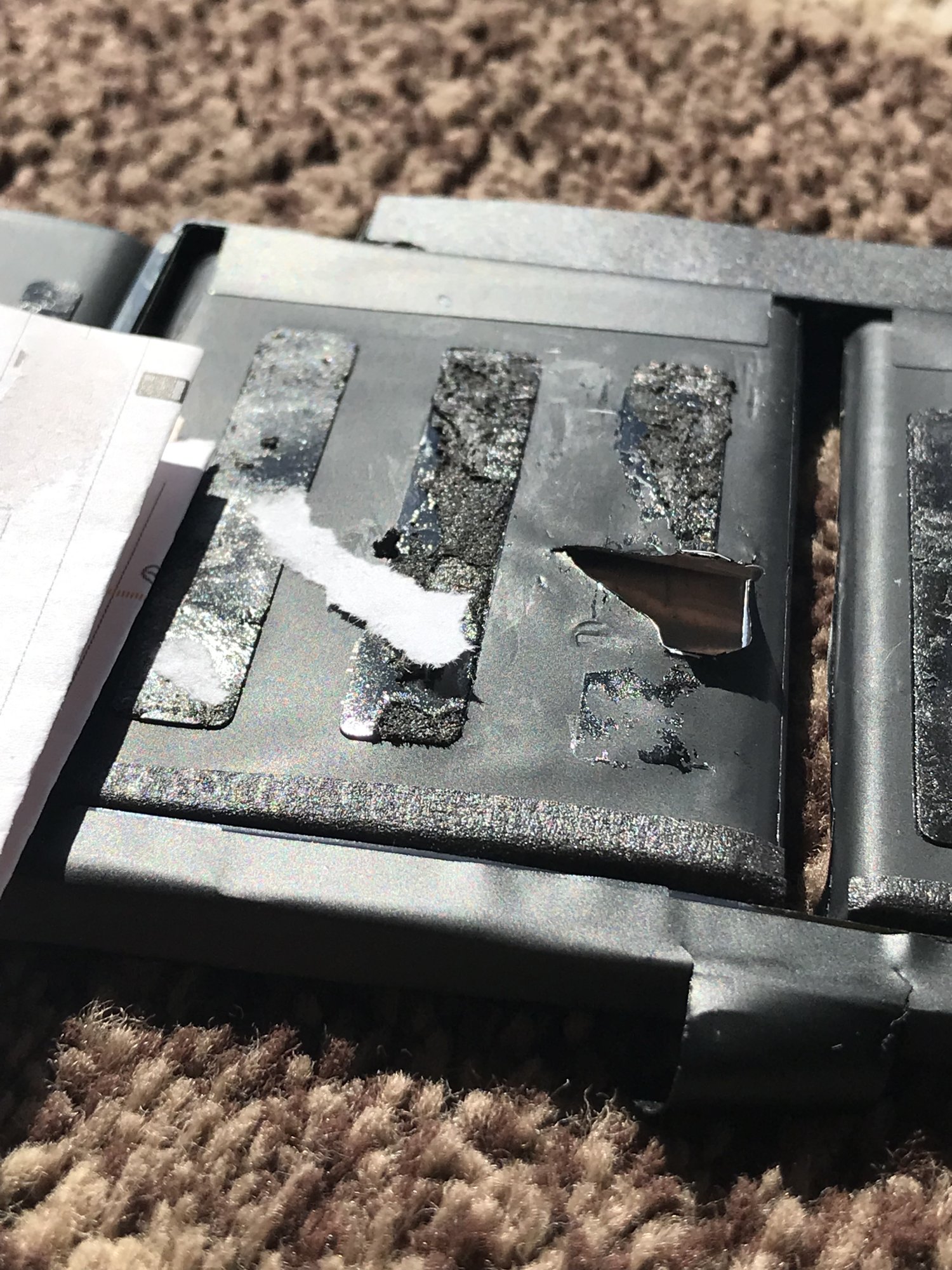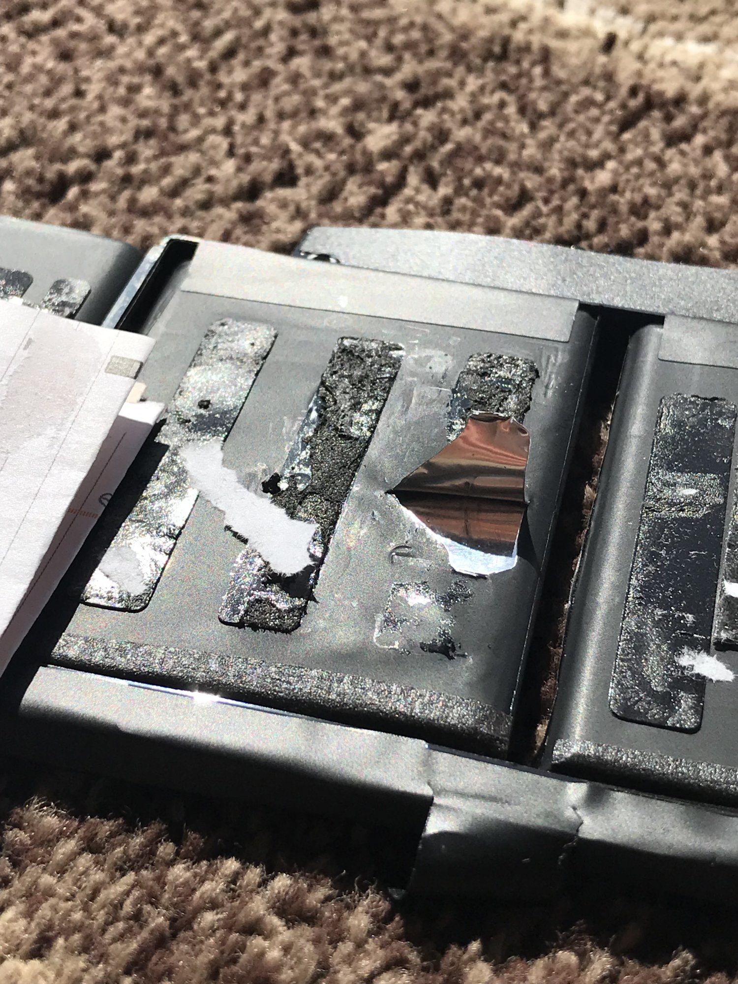 Long story short, I was working on my 2015 15" MBP trying to remove the adhesive off my old battery and I accidentally punctured and sliced into the battery, peeling the outer covering a little bit. Is the battery safe to use? The battery still functions and charges it's just punctured a little bit and the slice doesn't seem to expose that much. Will this battery blow up or cause harm or can I cover the slice with some packing tape and still be safe? I have some photos attached that you can refer to.