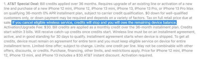 Yes, I am sure you are right. It would be too much to ask, for me to get such a generous trade-in and not have some kind of obligation to AT&T (or whomever I have as a carrier). Thanks.Based on the language used in the footnote on Apple's page, you have to maintain the plan for the duration of 36 months or they cancel the credits and you have to pay the balance of the phone: " If you cancel eligible wireless service, credits will stop and you will owe the remaining device balance."View attachment 1831453