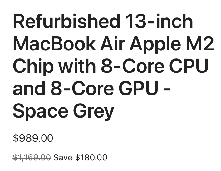 One of my best recently is I bought an Apple Watch Ultra 1 refurbished off eBay in Feb. for $335 which was a steal on its own.Yeah, I bought a 2017 13" MacBook Air in 2021 off Kijiji, and it was pristine. I could tell by the serial number that it was an Apple refurb, but I didn't care about that since as well all know, Apple refurbs are excellent.