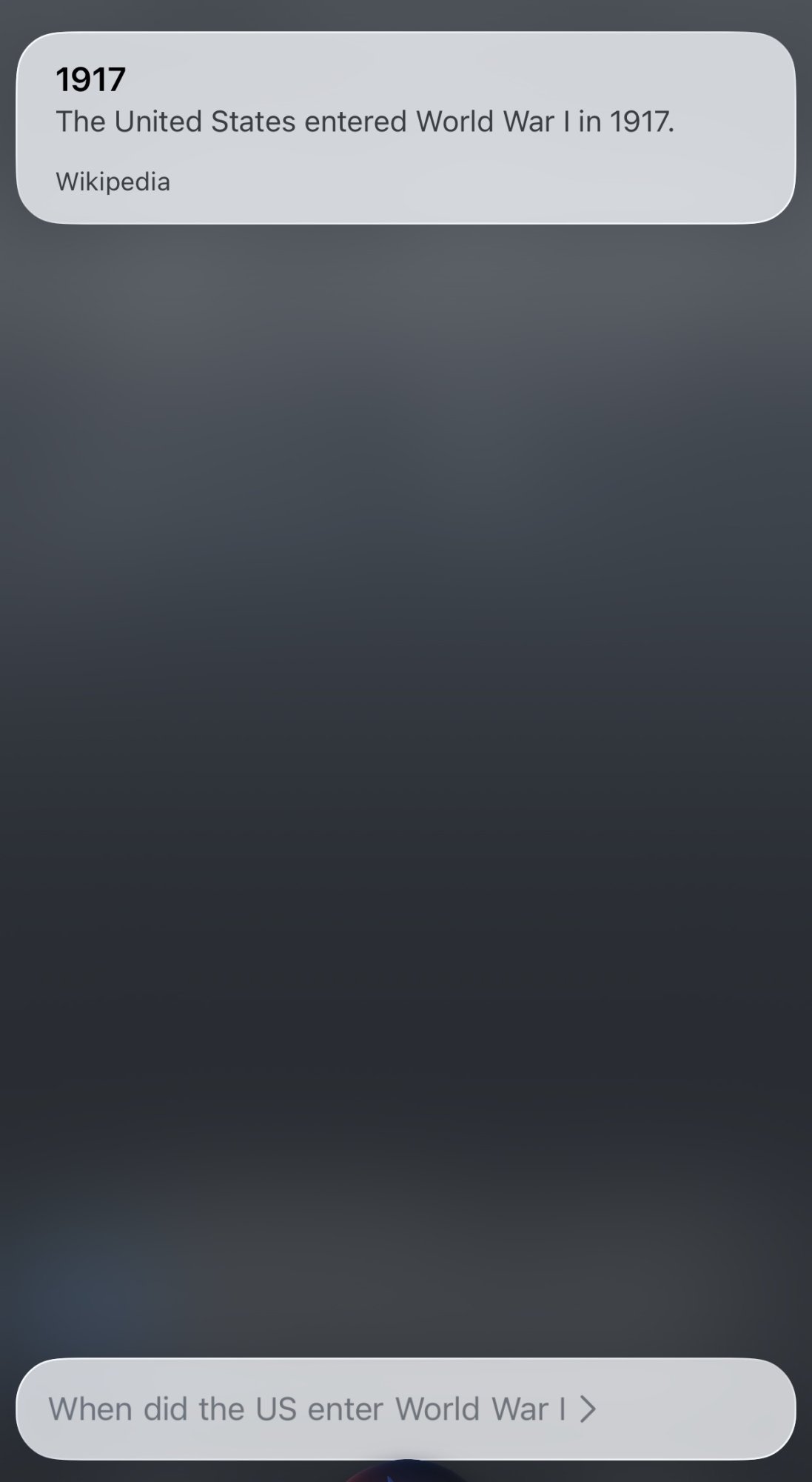 Second, Siri is worse at answering questions. An example: "Hey Siri, when did the US enter World War One?" Siri: "The US entered WWI in 1914." Nope, wrong. It didn't even say "WWI began in 1914", which would be correct but not what I asked. Siri replies as if answering the question I asked. "Hey Siri, using ChatGPT, when did the US enter WWI?" Siri does not read the answer, only shows it on screen: "April 6, 1917", looks correct. Siri reliably gets this question wrong, even if I change the words, "when did the US begin fighting", etc.