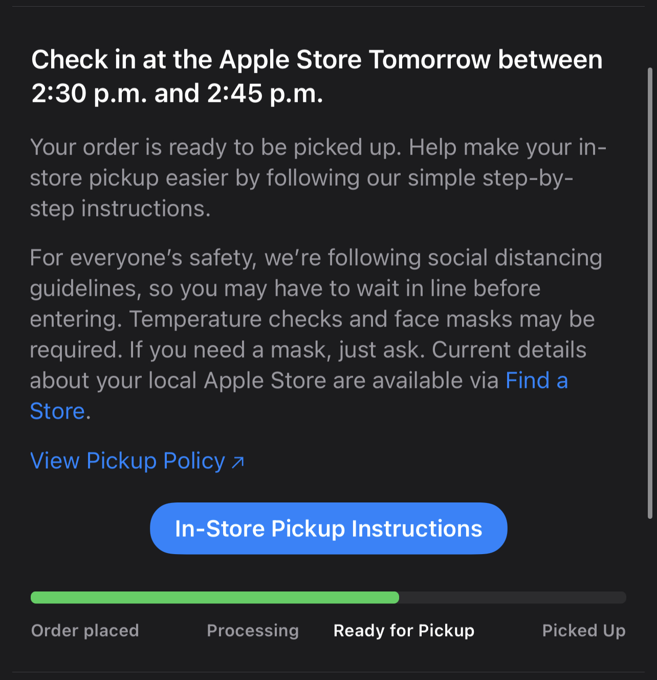 Yeah I think it’s because they are not going to sell you inventory that isn’t already at the store. So if ordered today for pickup tomorrow, the phone was already at the store when you placed your order. I think they are just staggering when people pick it up in an attempt to lessen crowds. Interesting that your order stills shows in progress.Interesting that those with pickups tomorrow are already being told it's ready for pickup. I have an appointment tomorrow, and it still shows that it's in progress.