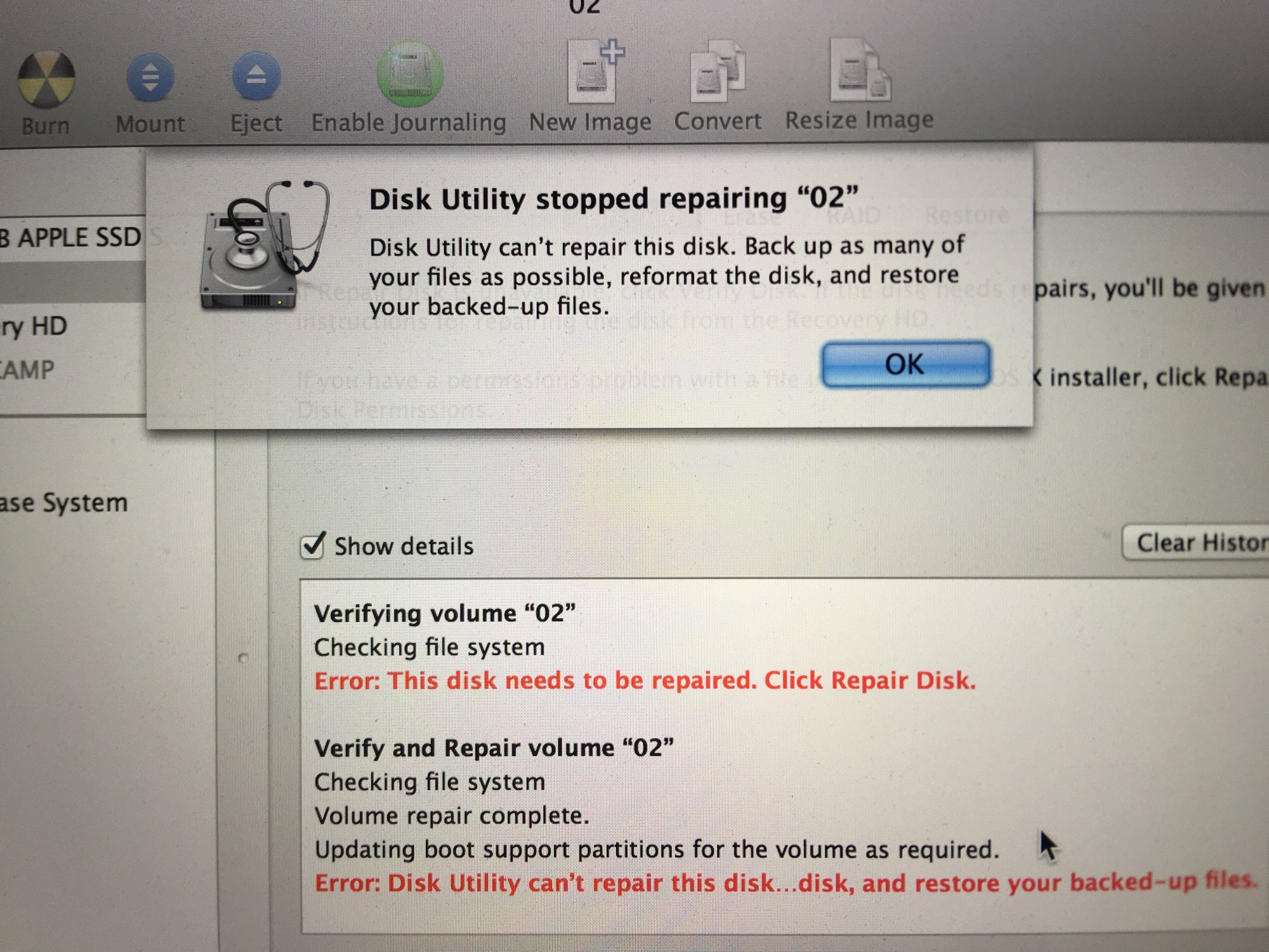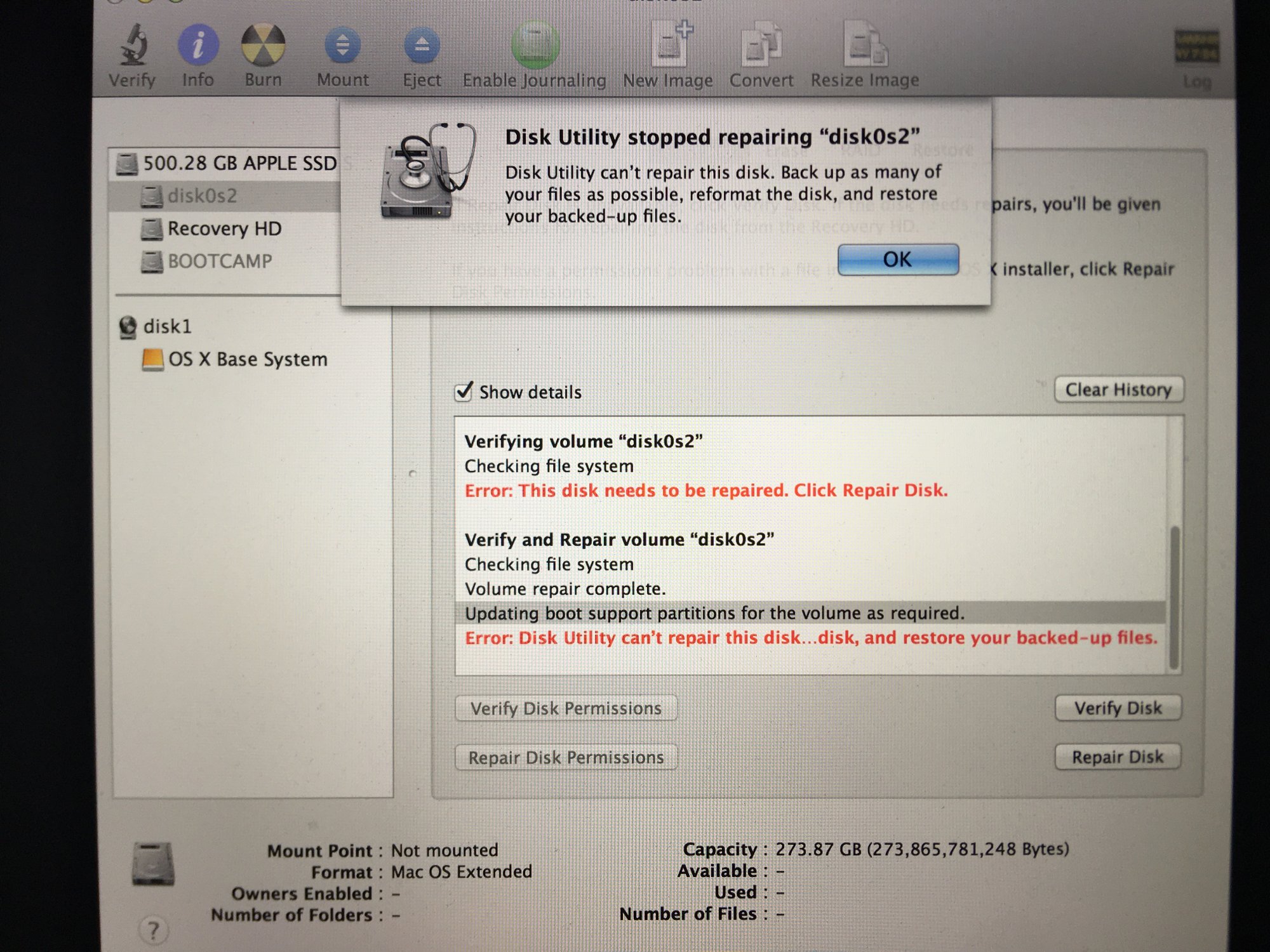 Edit: I tried to do a repair after and it gave the error “Disk utility can’t repair this disk...disk, and restore your backed-up files”. Not sure why it said disk twice.