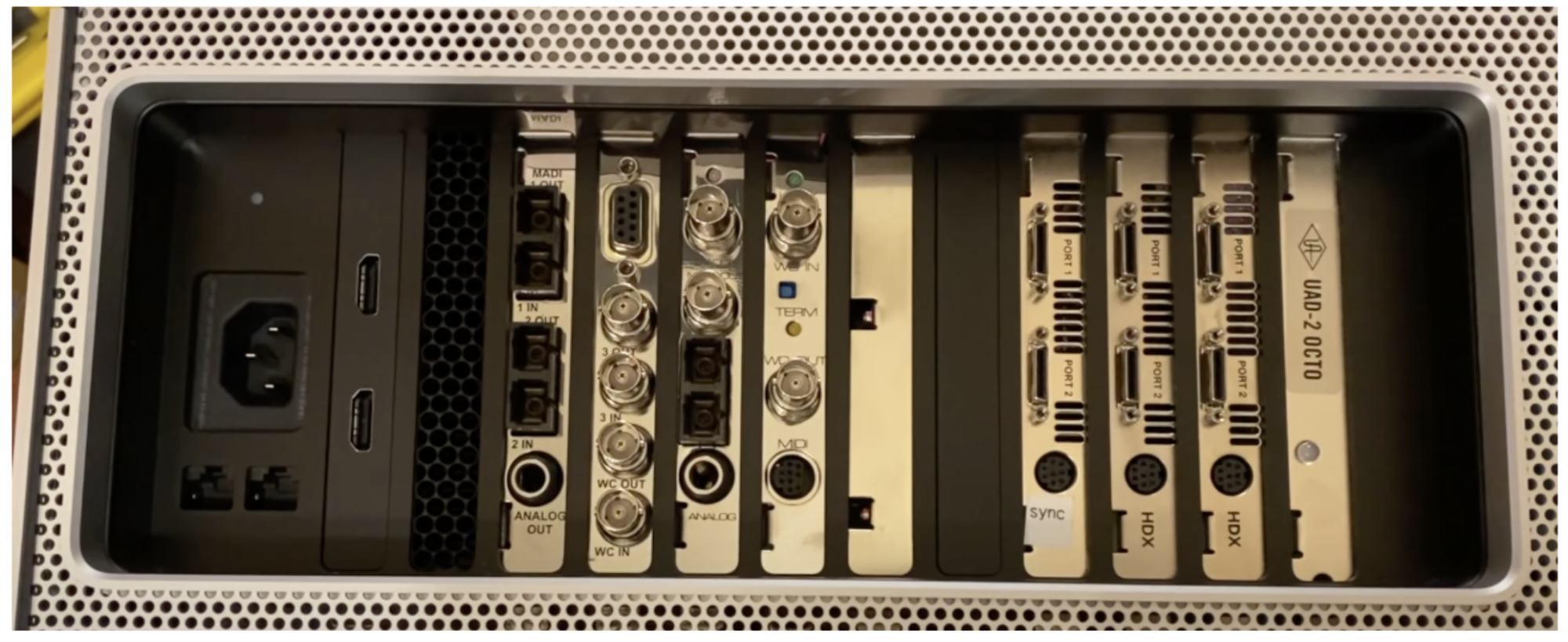 Connectivity, for many pros, includes being able to plug in their various PCIe cards. Here's one with a host of different audio cards: