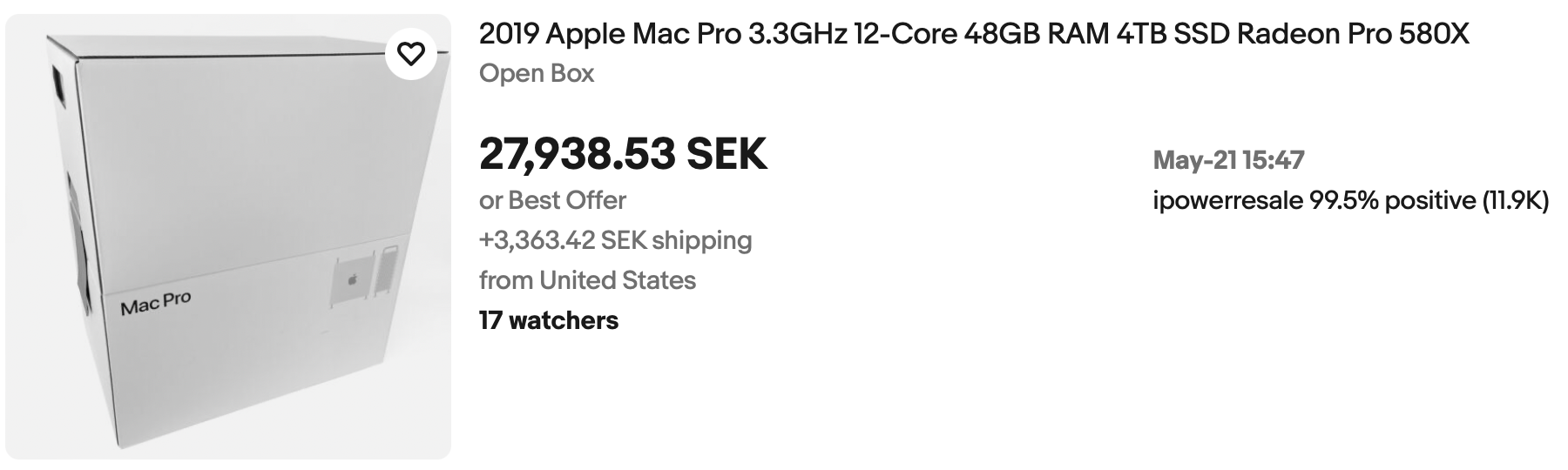 €1.200 extra for the Vega II card is to much. When there is a brand new card for sale at €1.249 in Netherlands.The GPU seems expensive. Is that a good one? Maybe it's also the A+ condition. RAM can be configured up to 786GB. But I think that's a too easy upgrade for letting it do in the store. I have to look for prices of ECC RAM. Is a higher clock speed possible than Apple sold?
