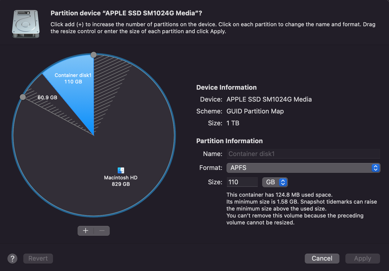 When I look at my hard drive in Disk Utility, there is a mystery partition called Container disk 1:The container disk can only be erased, but not removed. I've Google around and lots of forums say that's normal. However, having 110GB taken up like that seems like a waste of space. Is it normal? Also, what is a snapshot drive?