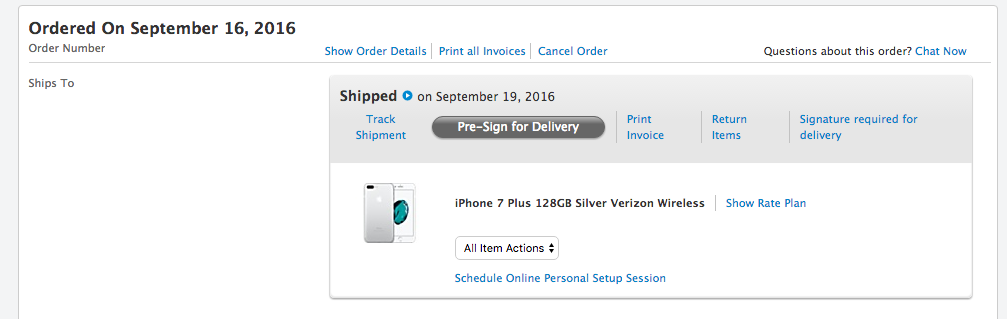 So I had a pre-order for a T-Mobile Silver Plus 128 with a 10/4-10/10 delivery date...canceled that order last Friday (16th) and re-ordered a Verizon Silver Plus 128 with a 10/11-10/17 delivery date. Woke up this morning with a Shipped email and a delivery date of the 22nd!! (2 days from order to shipping)