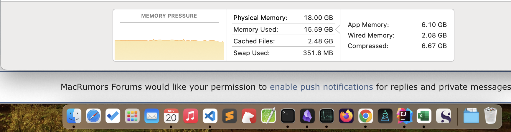 That screenshot shows that you still have unused RAM. You're using less than 16GB on an 18GB machine. It looks like maybe a Chrome tab you haven't looked at for a while got pushed to swap, but that's about it.Yes it's the newest version. As of now, I have Intellij(empty project), Chrome with <20 tabs, terminal, obsidian, vscode, Apple Music, Excel. That's it. View attachment 2315082