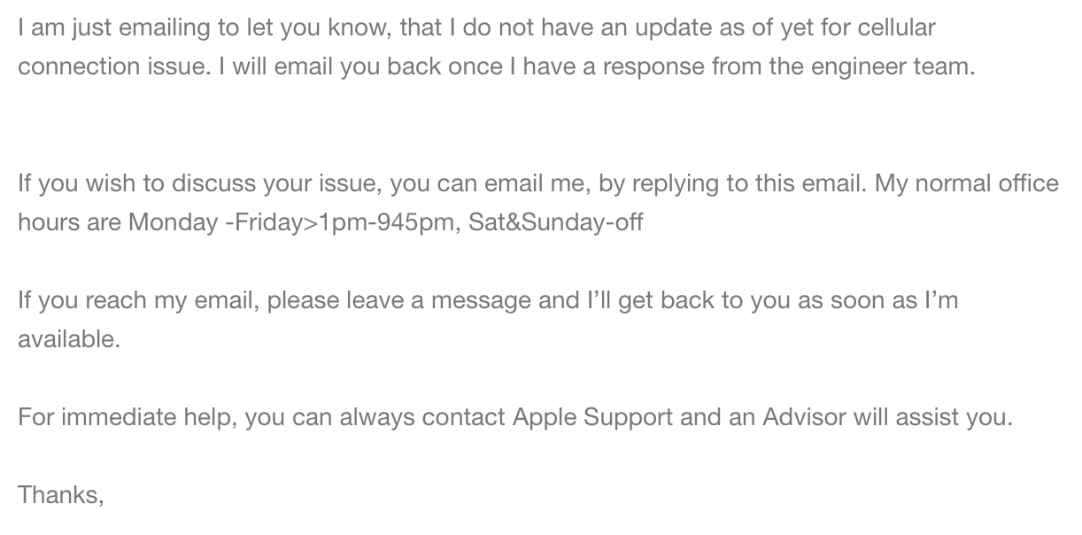 When I returned my second Max yesterday, the Apple return guy asked if there was anything wrong with the phone. I told him about the cellular connectivity issues and he said “hmmm”. When I told him I bought an X at Best Buy, he said that he was surprised that they had any left. He also said that he also had an X. That was it. No trying to get any further information from me.Clearly the messaging changes depending on the support person: