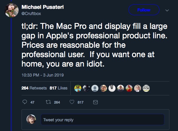 Now, that gentleman made some very good points in his thread on the subject, but I politely disagreed with that part. I'm sure many would. I tweeted him some counterpoints last night. 'If you want one at home, you are an idiot'? I'm an idiot, then. If I buy a 2019/2020 MP- and it's a big if....