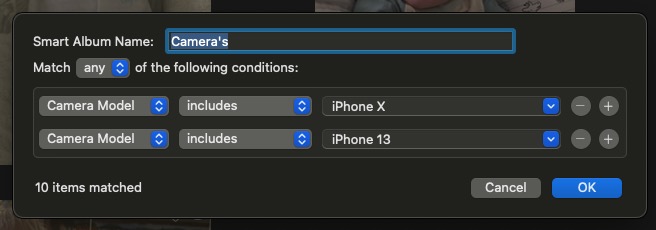 Last year, I switched to an iPhone 13. When I went to add the iPhone 13's camera model, it didn't show me any photos because the settings were set to match "all" the conditions, and a single photo can't be both from a 13 and an X. When I tried to set it to "any," all the photos and videos in my gallery were added to the smart album, except the ones taken by my sister's phone.
