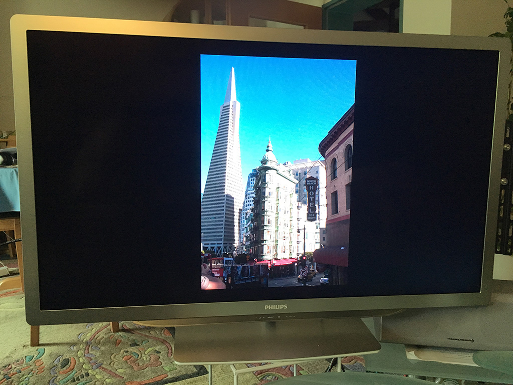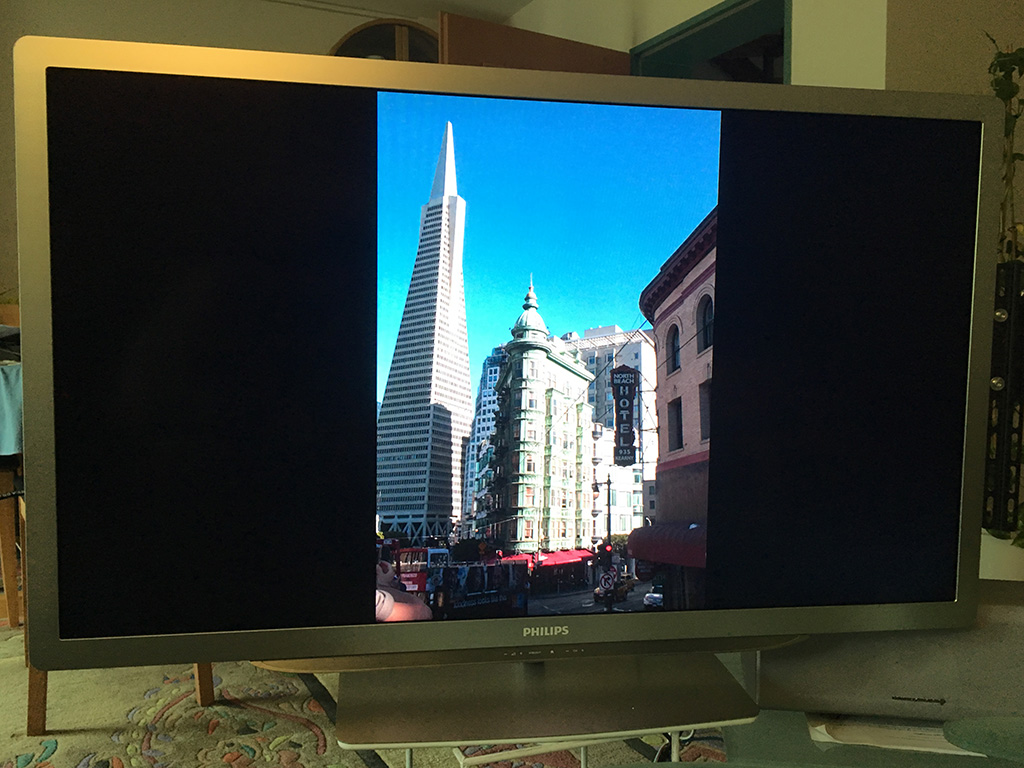 Attached two pictures. 1st with a generic image viewer, 2nd with Photos.app which switches to fullscreen on the TV.