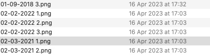 this is why I create files of with the format yyyy-mm-dd-descriptive-name.extI have a number of files (@300) that are in the format dd-mm-yyyy and a separate number at the end for each file of that date.