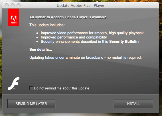 D dacoolest macrumors regular Nov 11, 2011 184 0 Apr 18, 2012 #7 I just got the same update notification. I uninstalled the installed version of Flash and reinstall it by downloading it from Adobe.