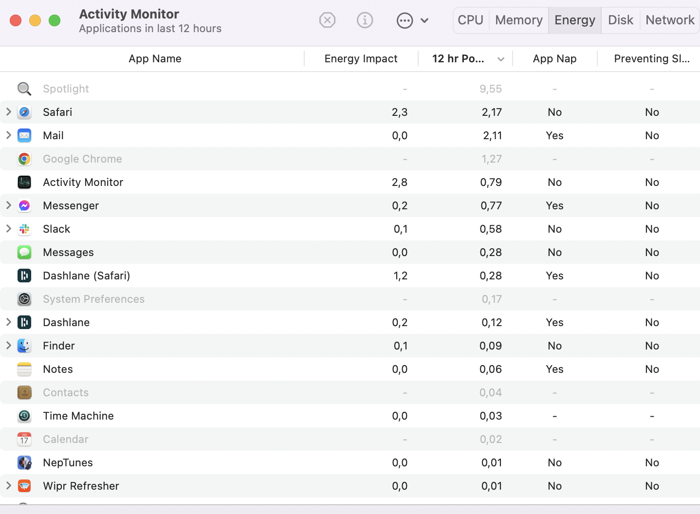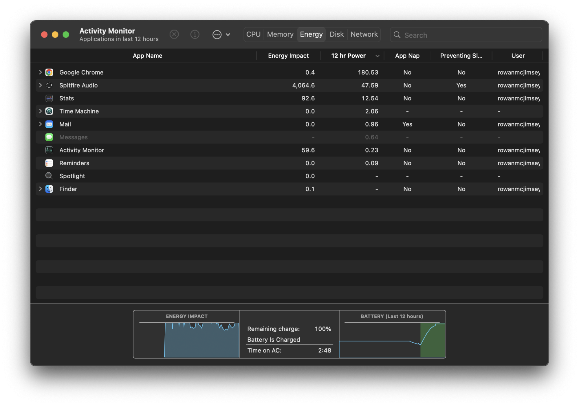 I'm noticing CRAZY values for "Energy Impact" and "12-hour Power" in Activity Monitor. I started to notice these after upgrading to Ventura. Is this REALLY true, or is this just not accurate? I am downloading around 54 instruments at the same time from Spitfire so obviously it should be using a decent amount of power, but nearly 4,000? And Chrome—what the heck? I am running 2 profiles in Chrome each with ~10 tabs. Screenshot below: