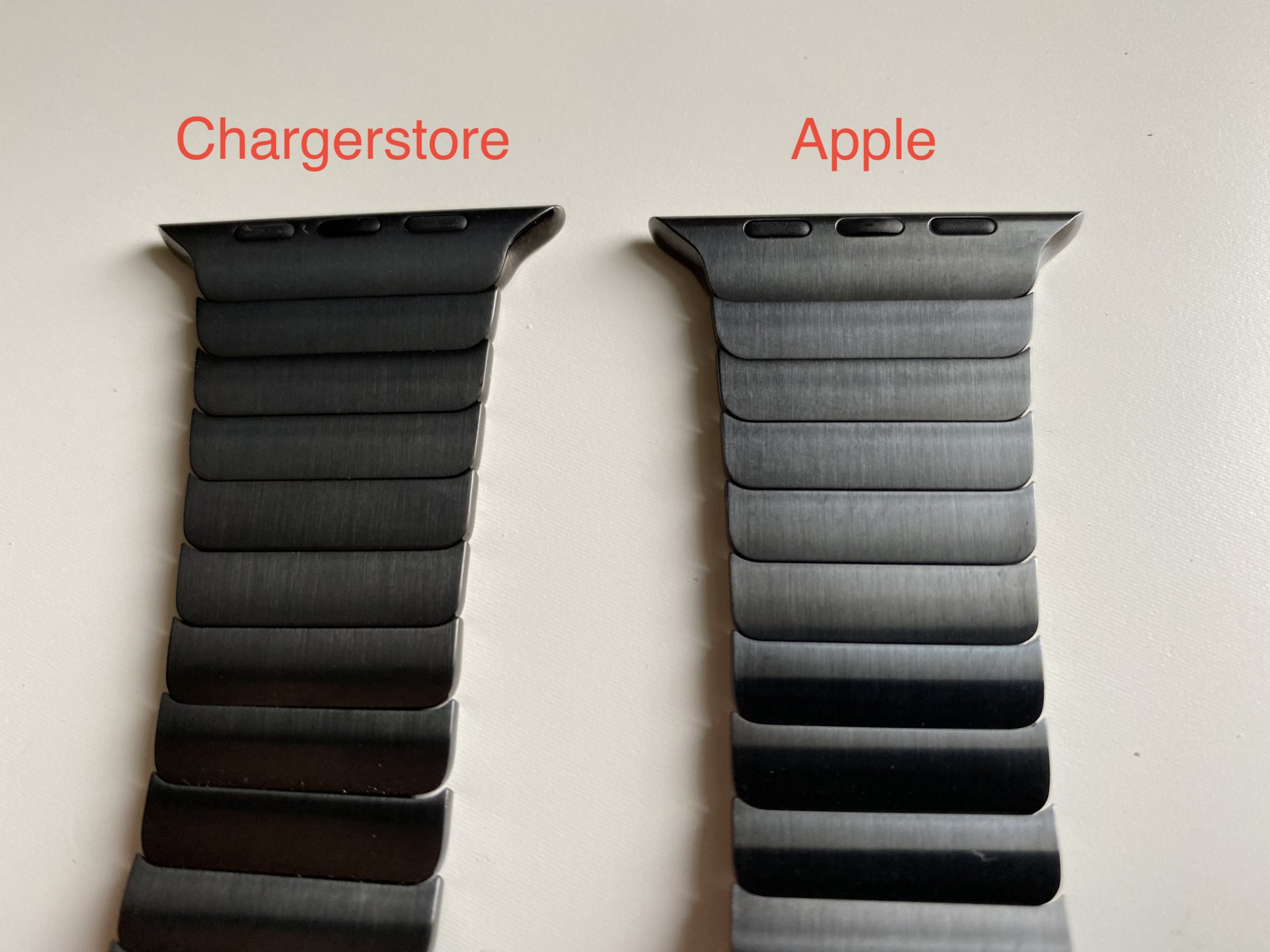 So I decided to try the genuine Apple link since the finish on my band from Chargerstore has been wearing off so quickly from nothing more than occasional contact with a desk or table. My Apple band arrived a few days ago and I figured I would share my observations for anyone interested since I have been able to compare the two bands side by side.