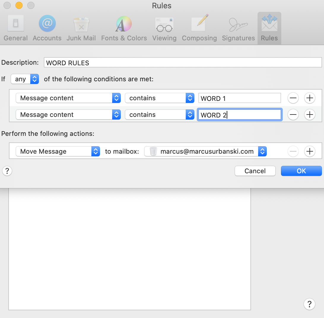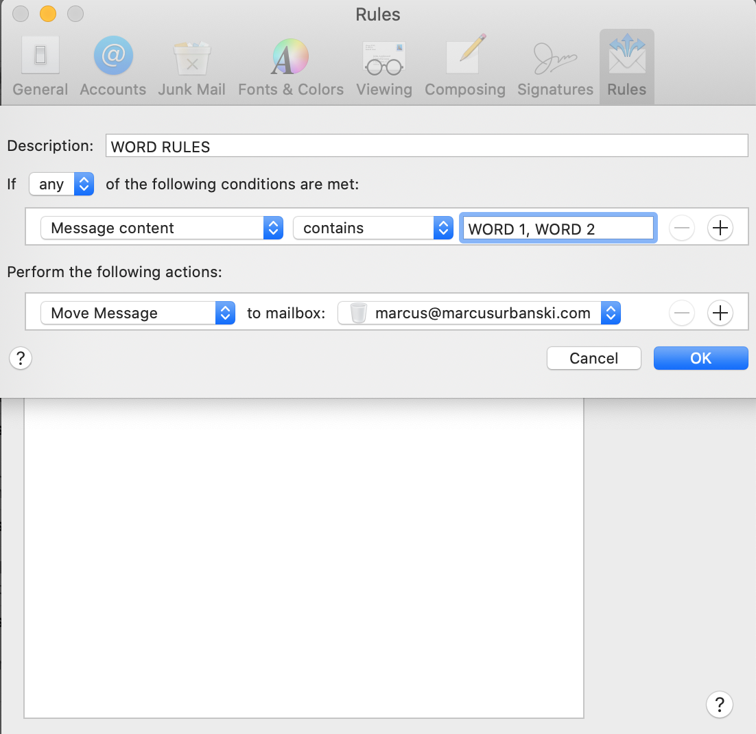 In this image I'm using one line per word, but I would like to use one line for all the words I want the rule to look for in the mail.