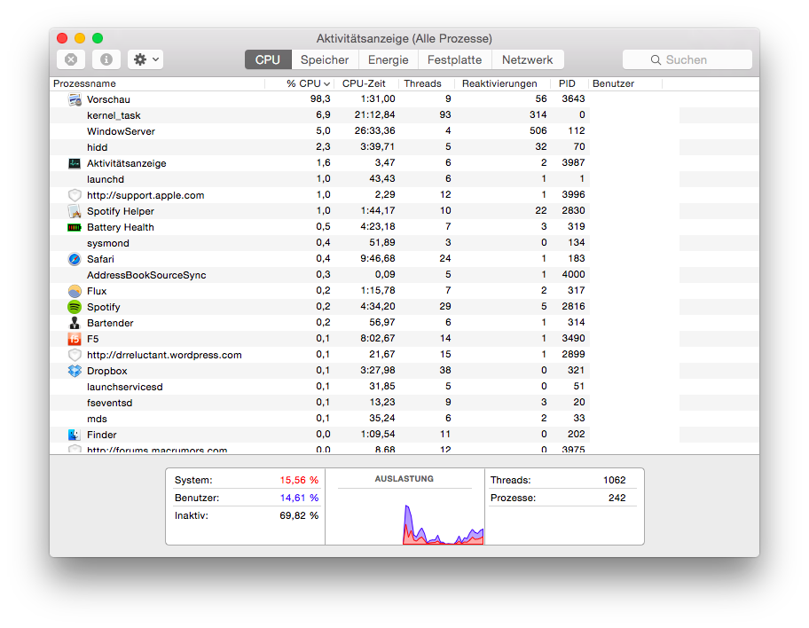 By all accounts, the system is idle. However, animations (e.g., switching desktops, etc.) are terribly laggy. Again, everything was smooth for two days prior to firing up Preview.app. I really do think the GPU drivers or WindowServer have a problem that Preview brings out.