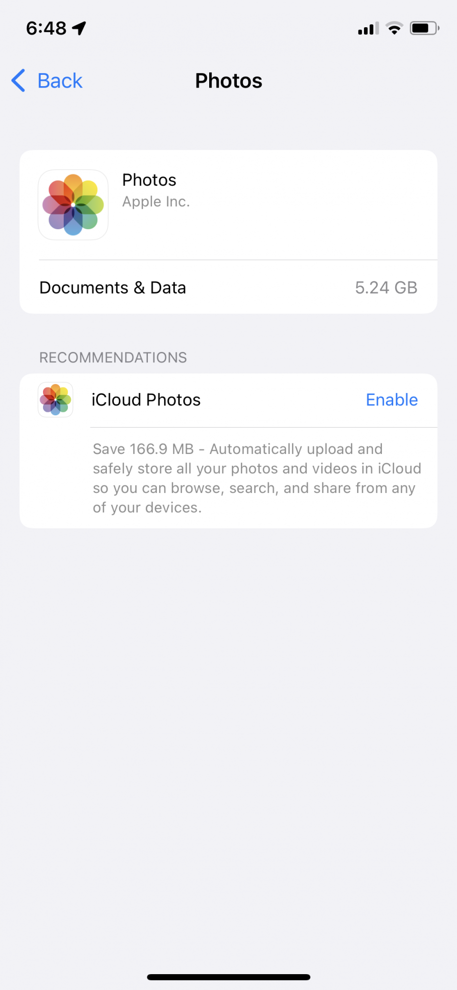I only have 167 MB of Photos stored in photos, but when I go into settings > iPhone storage, it shows 5.29 GB of photos. I don't use photos in the cloud and I have already tried resetting and backing up/restoring my device. I have nothing in the recently deleted album either.
