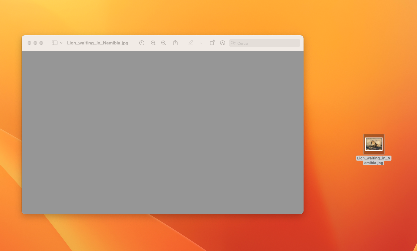 Hello everyone, I'm new to the forum. I have an Imac 27" late 2012 and I successfully installed ventura (now up and running for months). Unfortunately after upgrading to 13.3 the ONLY problem encountered is with the preview app (which is fantastic). The problem is that if I have an image on my desktop the thumbnail is displayed correctly, but if I try to open it with the preview app I only see a gray square. In reality it is only a display problem; let me explain: if I make changes to the image (for example drawing above a square and I save the image, the change is made (obviously I open the image with another app). It's like everything is working fine but when you open the image for some reason it doesn't show. I attach a screenshot to be clearer. Has anyone had the same thing happen or do you have any suggestions?