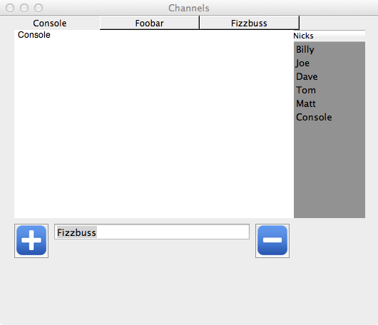 I'm experimenting with making an IRC program. If you're not familiar with IRC, you can be multiple channels at once. In the client, you can switch channels (chat rooms) and the chat log as well as the nick list (the list of other people in the channel) will reflect what is in your current channel.