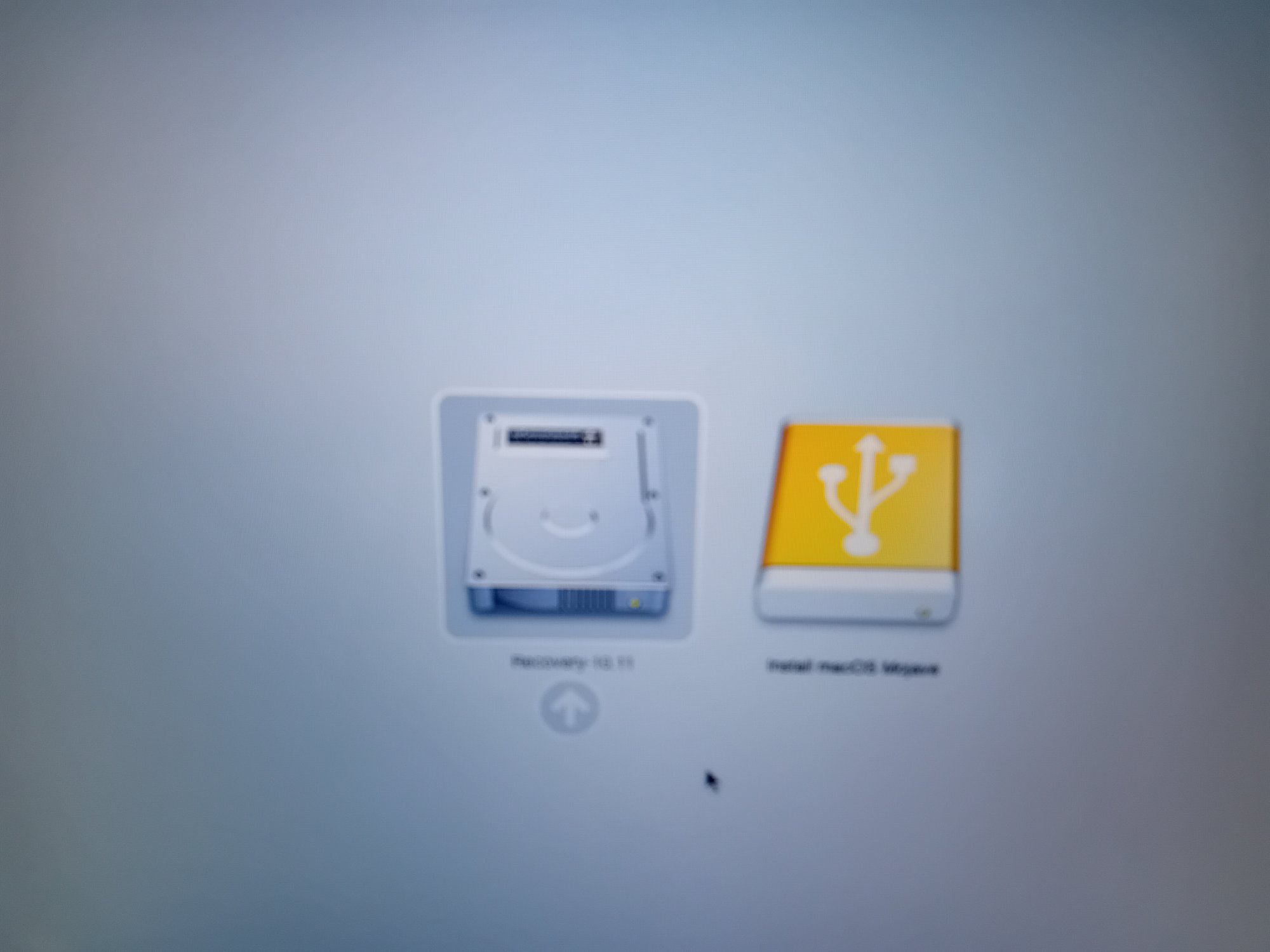 I tried to install Mojave from a USB drive (see attached -pic is blurry but first image says Recovery, second says "Install macOs Mojave". I click the install button, but the screen goes grey with a circle with a line through it, then the computer shuts itself down.