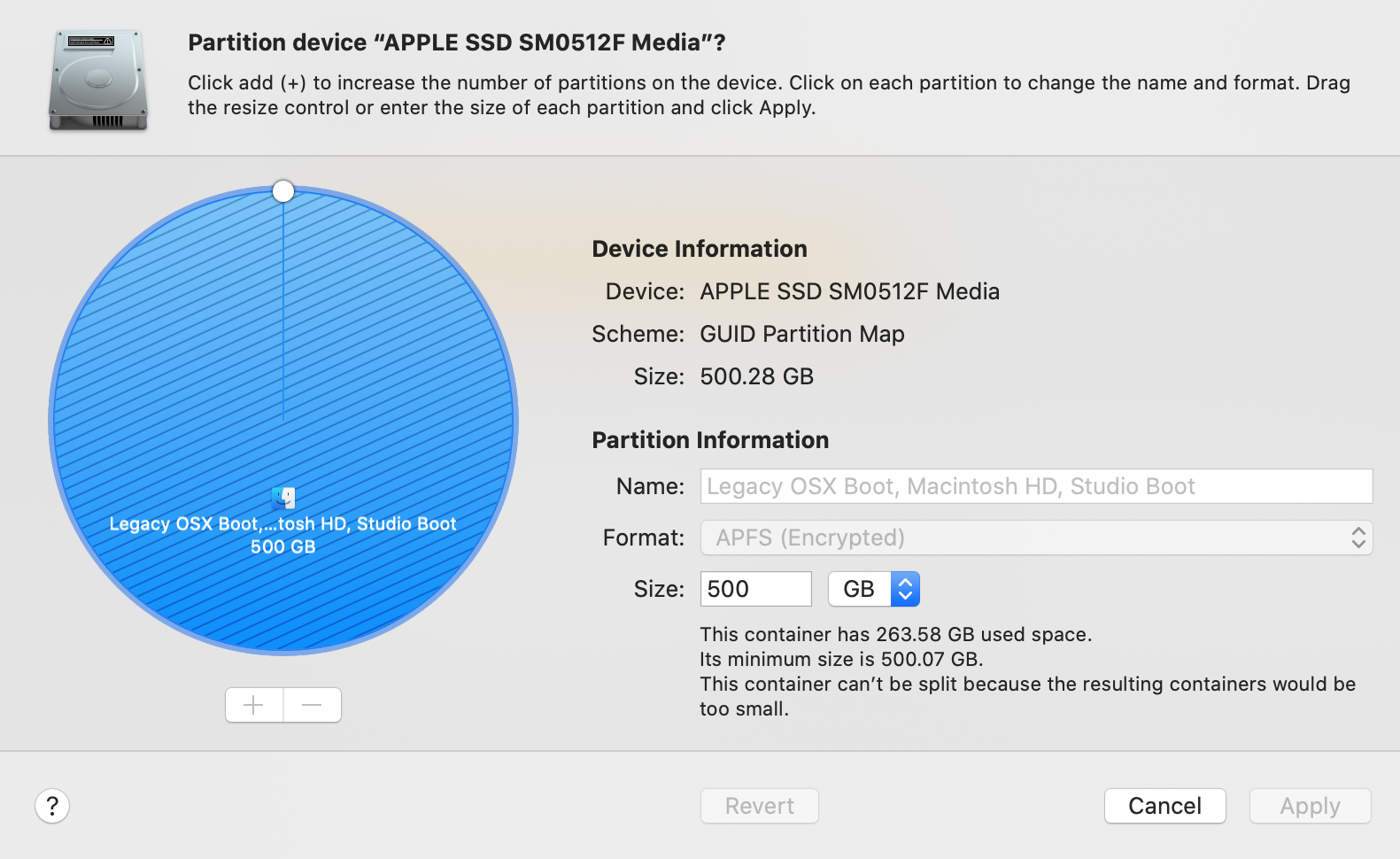Partitioning my hard drive - went through disk utility and tried to partition but all of the buttons are greyed out, it says "This container can’t be split because the resulting containers would be too small", as you can see below i'm using just over half of a 500GB drive so plenty of space?