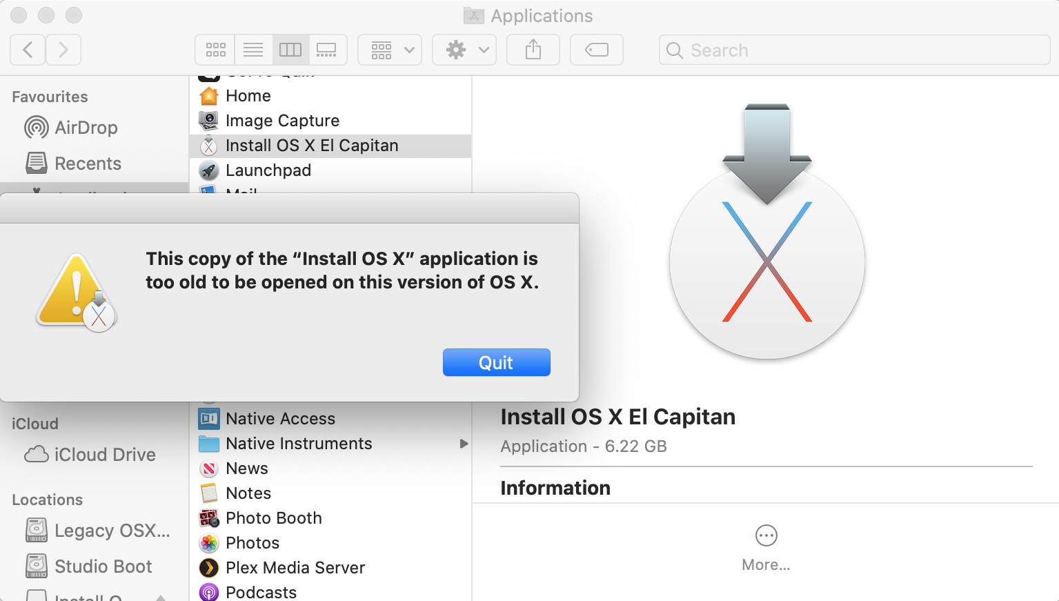 Next I try the El Capitan install (I'm in Catalina, but assuming I will get a prompt screen where I can select my new volume to install to) but get an error message that my copy of El Capitan OS is "too old to be opened on this version of OS X (i.e. Catalina), note I D/L the install file from the Apple site.