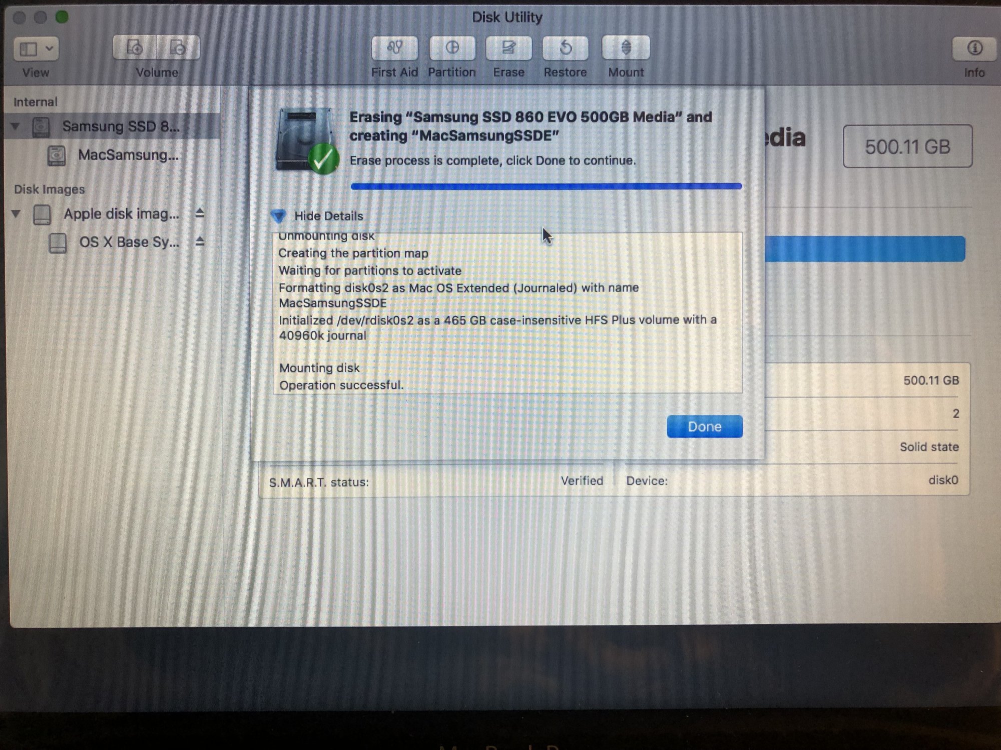 Hi guys, I'm new here. I have a late 2011 MacBook Pro 13-inch. The original HDD on this system started failing, so I replaced it with an SDD Samsung 860 EVO of 500BG. I also updated the RAM. After replacing the original hard drive with a solid state drive, my MacBook Pro ran extremely slow. Just to hit an icon like the apple button to check the system, took a minute or two with a search color wheel. So I decided to just reformat the SDD and redo everything again. I also want to mention that my Time Machine wasn't reading my SDD. I don't really care about erasing everything on here, because prior to that I backed everything up on an external drive. I just want a clean solid macOS installed with absolutely nothing. However, when I try to do that and reformat my internal disk, it seems like I still have volumes on my partition, and it shows up as full. I did erase the Macintosh HD before that, because my Samsung SDD internal drive wasn't showing up on my disk utilities. When I erased my macintosh HD, I was now able to see my internal SDD. I'm still having an issue with the partitions and not being able to erase the volumes on the SDD. I don't know a whole lot about the partitions, especially on a Mac, but I can't even load a clean install of High Sierra macOS, because I keep getting an error message that says, "The recovery server could not be contacted." I did set the correct date on terminal many times, and even to match apples time servers. I made sure I had internet and WiFi was on, I also tried changing the date on terminal to when High Sierra came out, but I still keep getting the same message. Not to mention I can't erase the volume on my SDD. Does anyone know how I can fix this? I will provide screenshots on here as an example(sorry if they are blurry, but I couldn't take screenshots from the actual Mac itself, so I had to use my phone). Any information regarding this would be helpful.