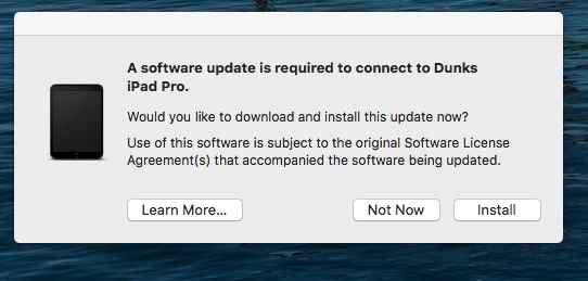 "If your iPhone, iPad, or iPod touch has a newer version of iOS than is supported by your Mac, you may see this alert: "A software update is required to connect to your iOS device. Would you like to download and install this update now?""